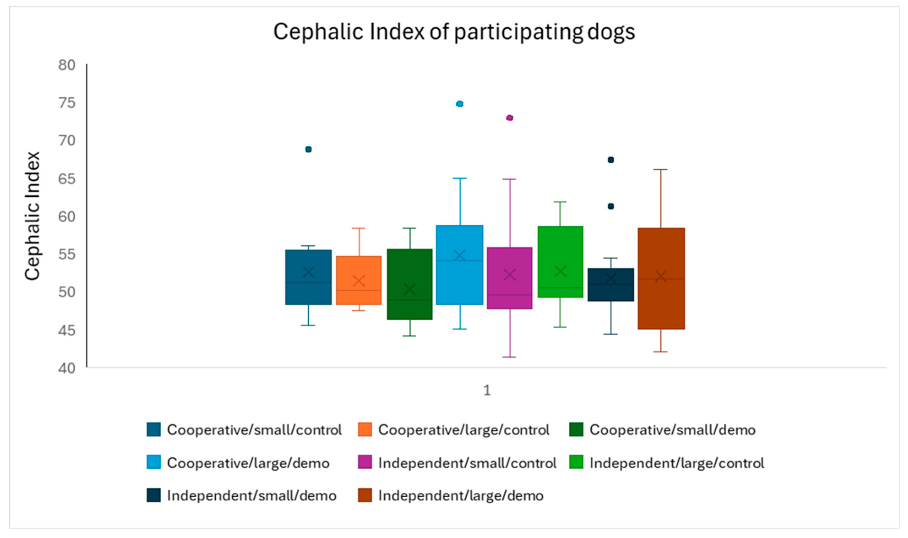 44], one could also predict that in their case, we will find less optimization for body size, and the working dog breeds will also negotiate the small opening without hesitation. Lastly, in this study, we avoided testing strongly brachycephalic breeds (dogs with high cephalic index) because earlier it was found that due to their forward-facing eyes and specific retinal structure [