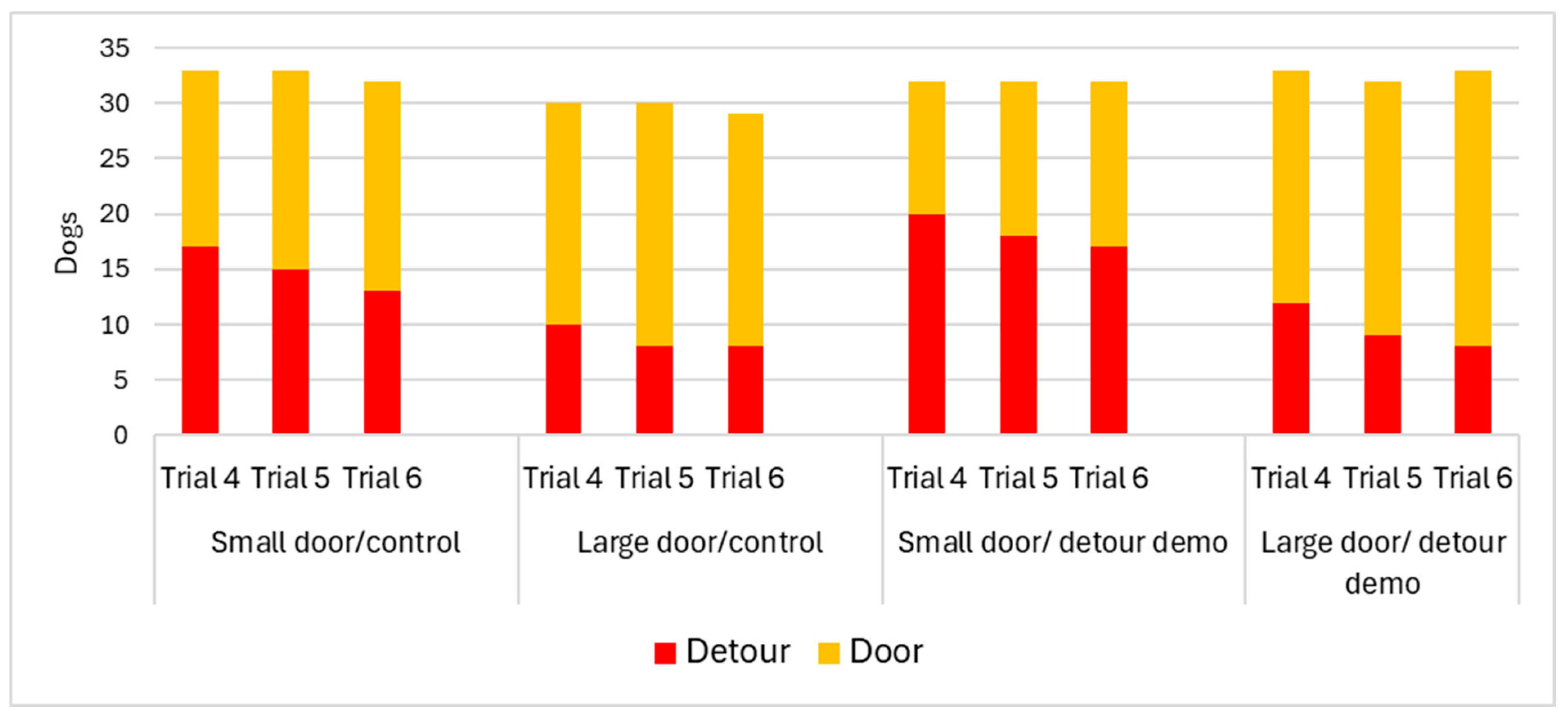 51]). In our current experiment, the detour was more than three times longer than the shortcut via the opening to the reward, and according to the results, dogs optimized their choices based on their body-awareness (preference for shortcuts in the case of large door vs. relative preference for detour in the case of small door and socially acquired reinforcement of making detours).