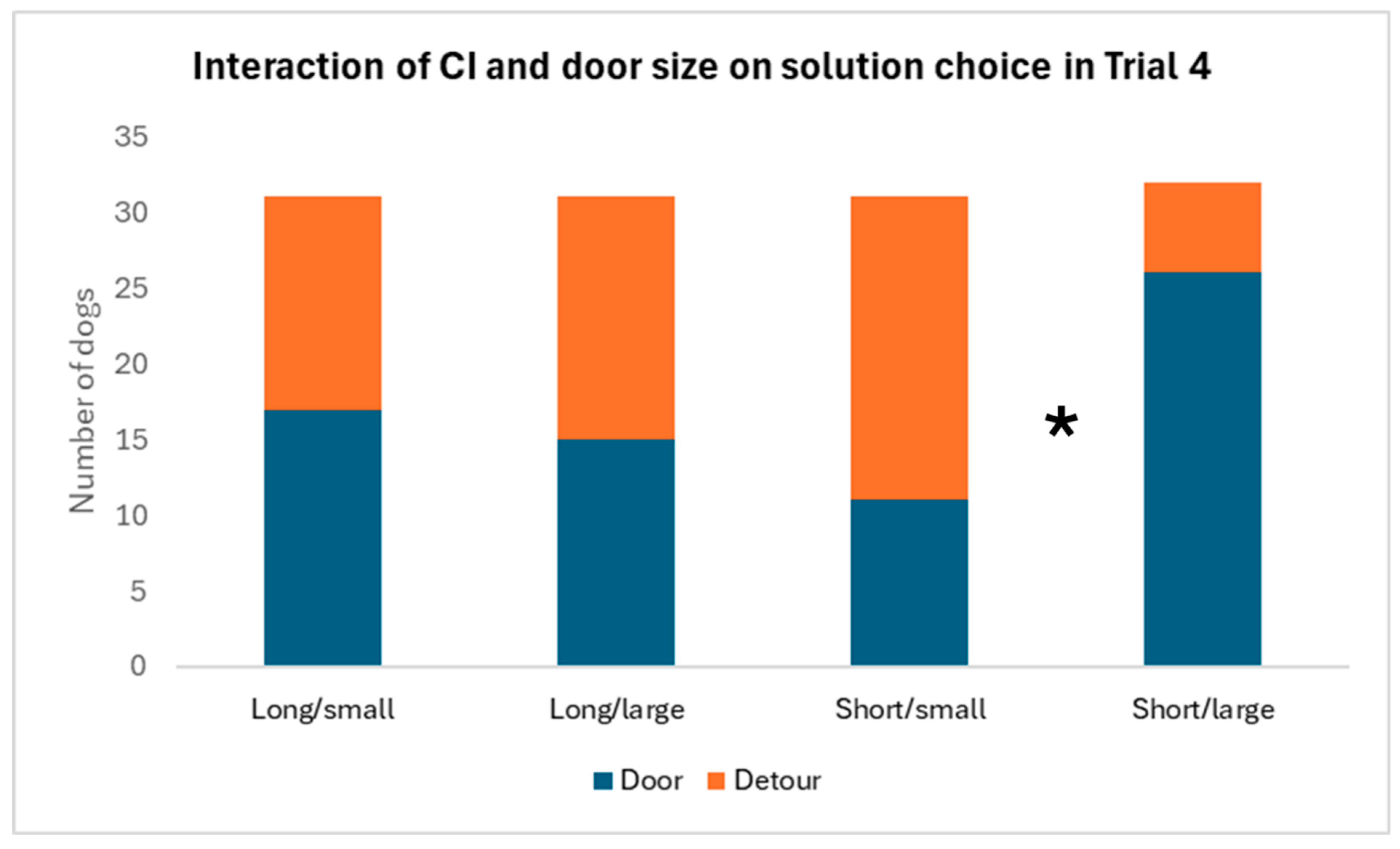 43], where the dogs could only overcome the obstacle via a single, gradually decreasing-in-size door. Our results can be parallelled with the behavior of cats, who hesitated when they were offered gradually shorter openings on a barrier and started to look for other solutions (e.g., jumping over the barrier) [