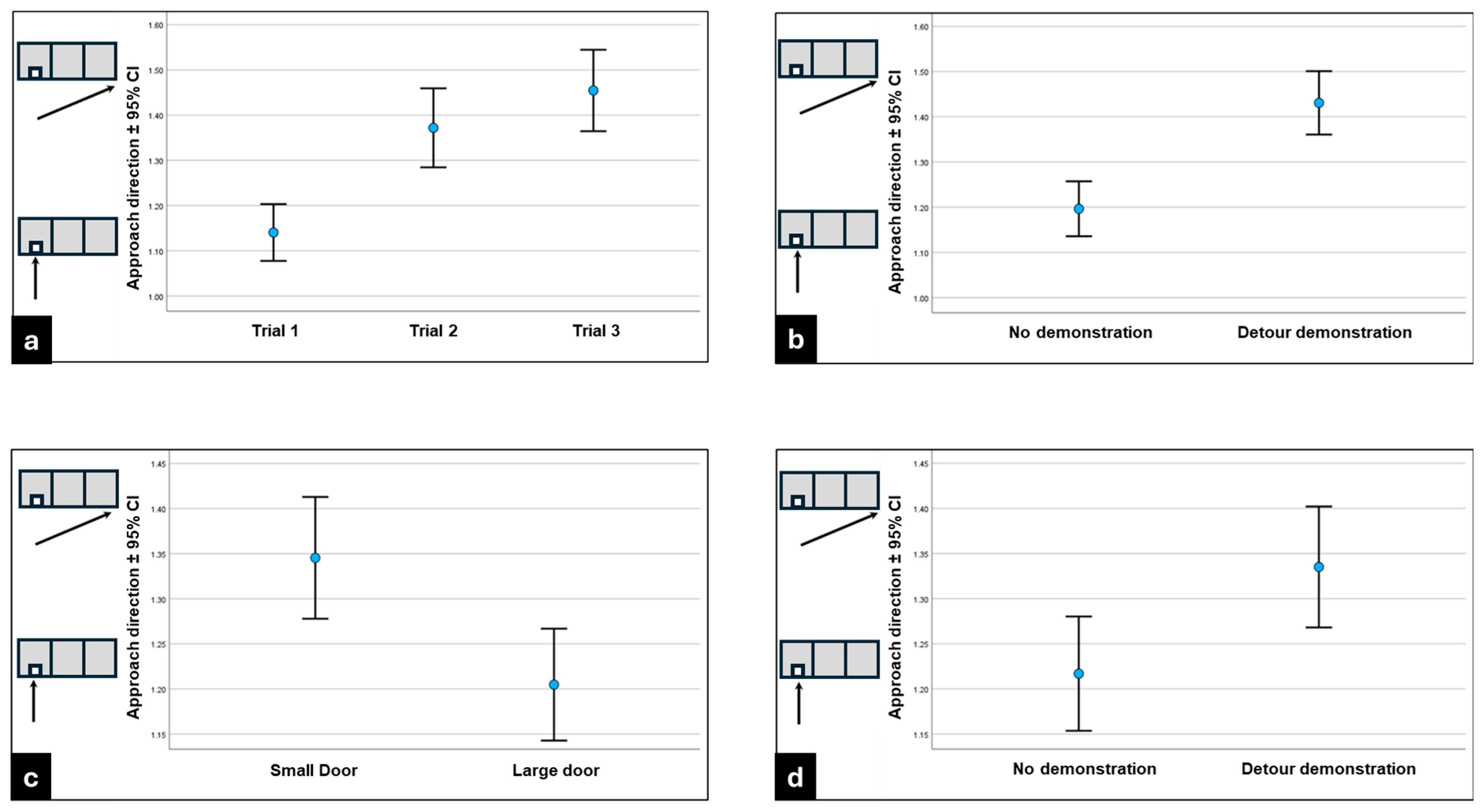 Figure 6c). Demonstration also had a main effect; when the dogs observed the demonstration in the previous three trials, they made more diagonal approaches (χ