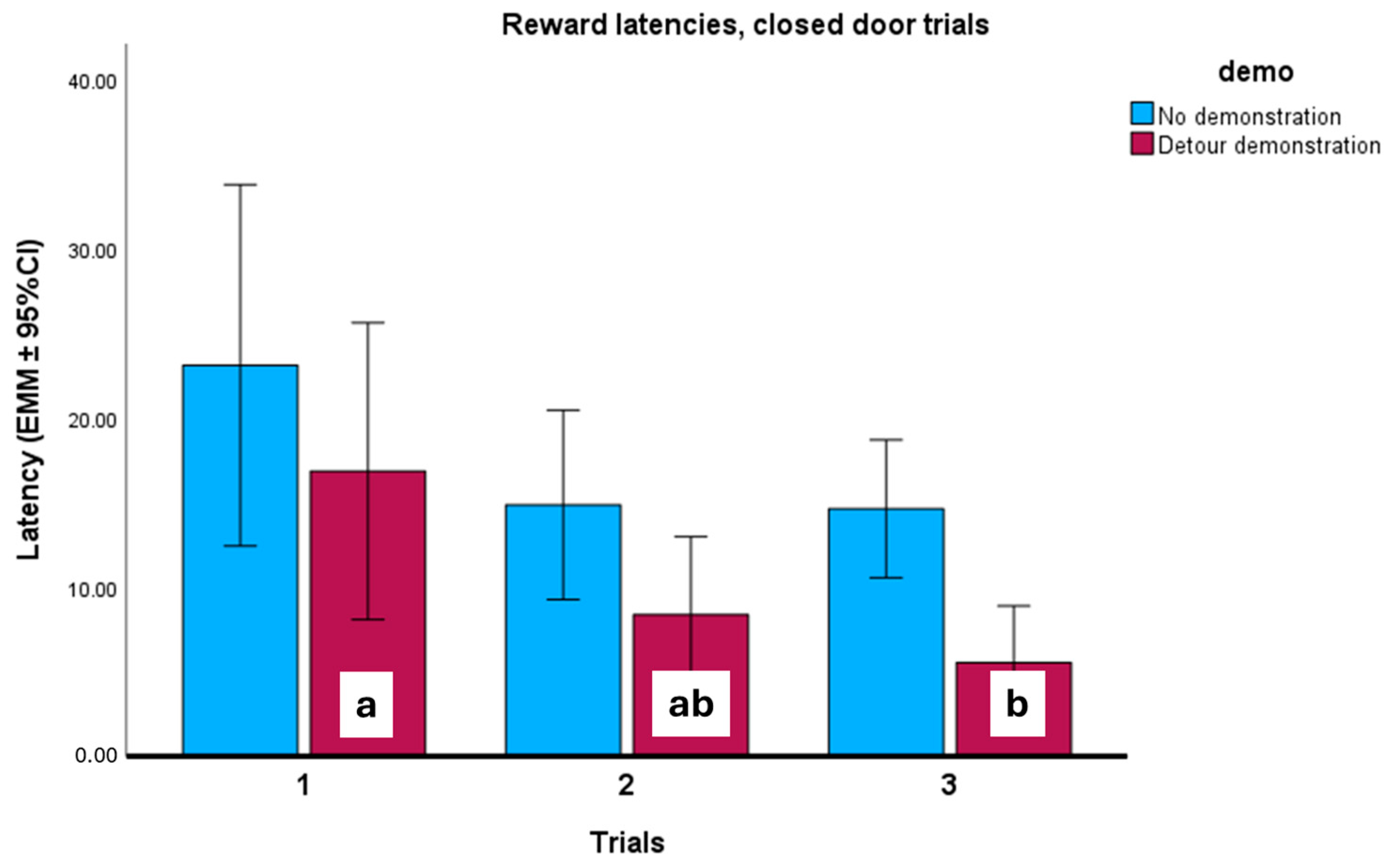 p = 0.045). The dogs in the demonstration groups reached the reward faster from trial to trial (