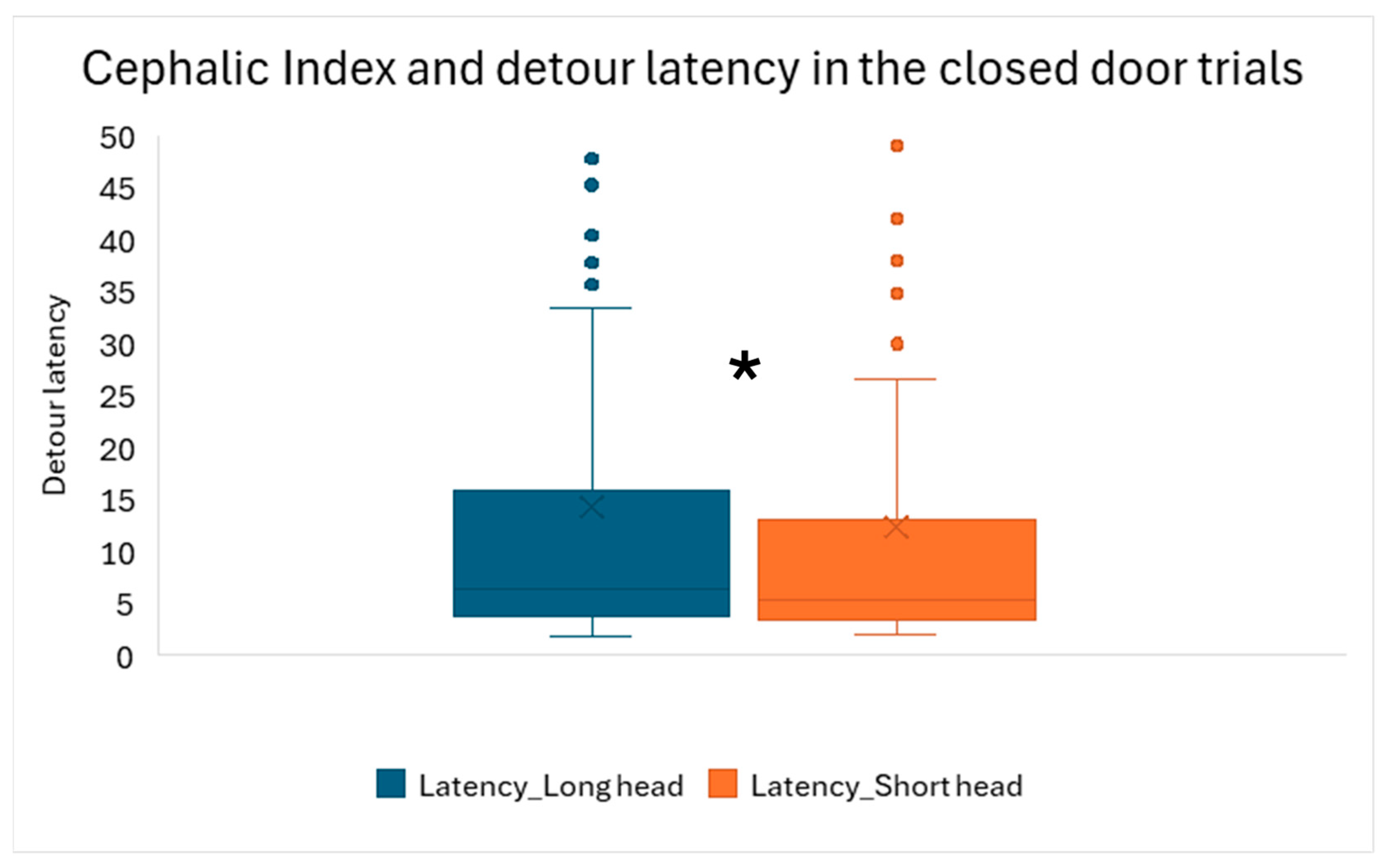 p = 0.030) had a significant effect. Shorter-headed dogs reached the reward faster than longer-headed dogs did (