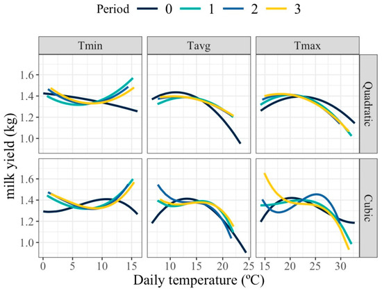 Quadratic and cubic polynomials provided similar patterns of response for period 0 and for Tmin in all periods, but differed for Tmax and Tavg for periods involving days previous to the milk recording day. For these cases, the observed HT threshold was higher than for the day of milk recording. The low number of available records, especially at extreme values of the thermal range, can make higher-degree polynomials more sensitive to outliers, which would affect the adjustment of the change points. In this specific case, given the low number of records in this study, quadratic polynomials, which are less sensitive to out of range milk production values, seem more appropriate.