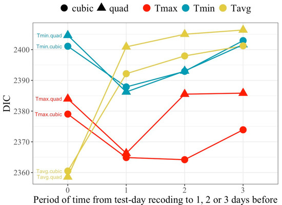 Cubic polynomials exhibited better goodness of fit than the corresponding quadratic fits, except for Tavg on the day of recording, although differences were small in all other cases. Regarding temperature type, model ranking for DIC changed over the lag periods. Tmax and Tmin showed better goodness of fit when accounting for lag effects (periods 1, 2 or 3), while Tavg behaved best for period 0 (no lag effect). Overall, the best fitting model was the one relying on Tavg on the day of recording, closely followed by the models fitting Tmax averaged over periods 1 and 2 for the cubic fit.