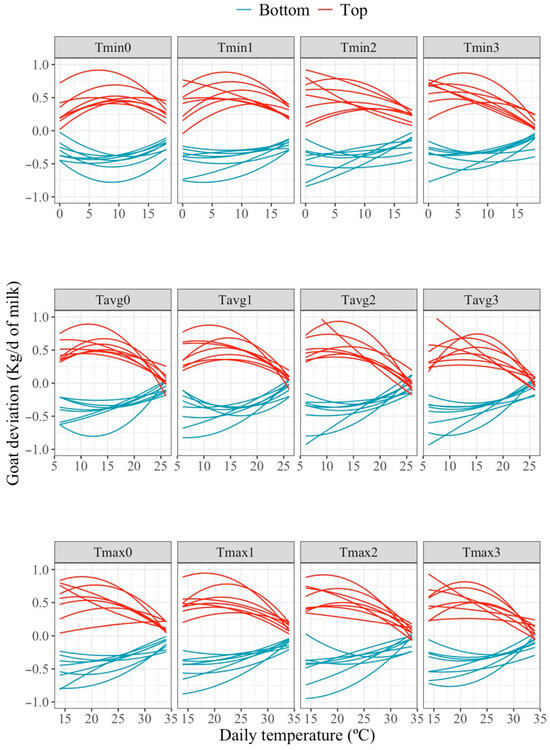 Figure 3 presents the predicted individual goat deviations in milk production with respect to the average response to changes in minimum (Tmin), maximum (Tmax), and average (Tavg) temperatures recorded at 0 day and in the period of 1, 2, and 3 days before milking for two groups of eight goats classified as the best (Top) and worst (Bottom) goats based on their milk yield at the average heat load (intercept). Please note that curves in this Figure represent the deviation in production for a given animal with respect to the average population response curve, implying that the expected production for that animal at a given temperature would be the sum of the average production estimated for the population and the animal’s individual deviation at that temperature. In other words, animals showing positive/negative individual milk deviation values at a given temperature are expected to produce more/less than the average. Thus, animals showing positive/negative slopes of change in the HT region can be regarded as more/less heat tolerant than the average. Although a variety of individual response patterns can be observed across animals, the EBV for milk production along the studied temperature range tended to decline at high temperatures for the top-ranked animals and vice versa. The pattern was consistent across all temperature variables and time periods evaluated.