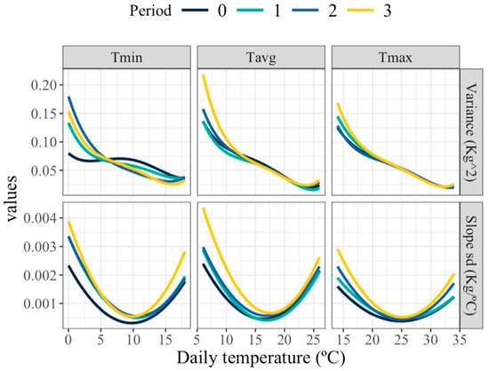 Estimated variance for milk (top row) and standard deviation of slopes of change in milk (bottom row) along the temperature scale under models fitting individual quadratic Legendre polynomials on the average of minimum (Tmin), maximum (Tmax), and average (Tavg) daily temperatures during (0), 1, 2 and 3 days prior to the date of milking.