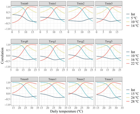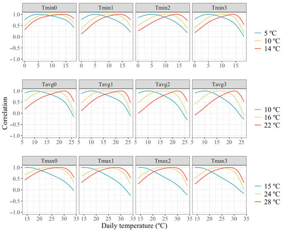 Estimated correlations of change in milk along the temperature scale under models fitting individual quadratic Legendre polynomials on the average of minimum (Tmin), maximum (Tmax), and average (Tavg) daily temperatures during (0), 1, 2 and 3 days prior to the date of milking.