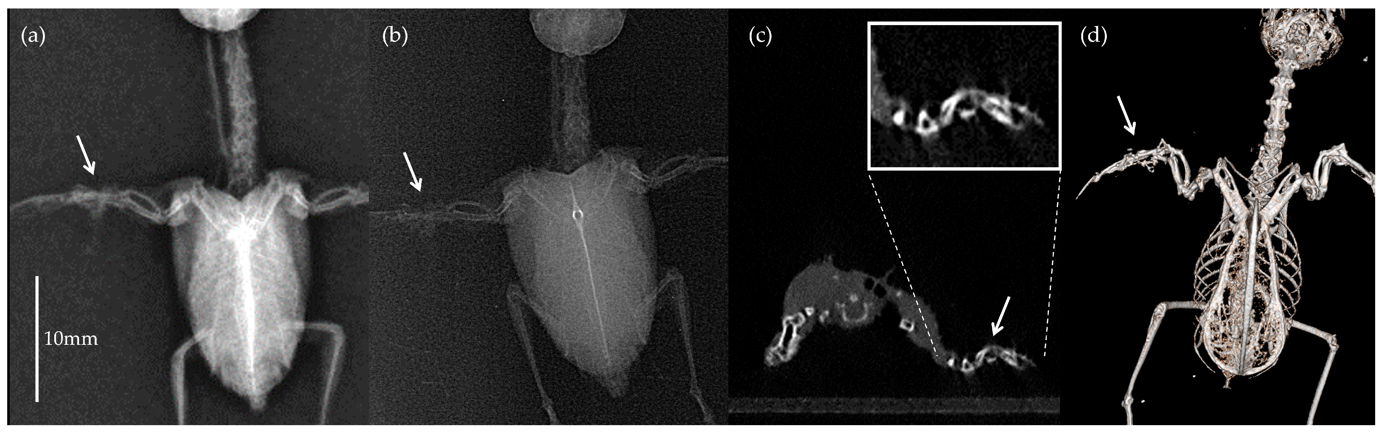 n = 3). Examples of the four different imaging modalities from the same hummingbird with a unilateral metacarpal fracture are shown in