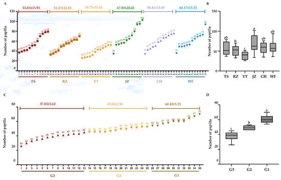 The number of papilla of A. japonicus in Group N1 and N2 and the significance analysis among them (each color in the figure corresponds to a population respectively). (A,B) Description about number and the significance analysis in Group N1. (C,D) Description about number and the significance analysis in Group N2. Different lowercase letters (e.g., a, b, c) were used to represent significant differences among groups; identical letters indicate no significant difference, whereas different letters indicate significant differences (p < 0.05).