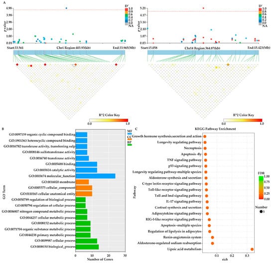 Functional annotations of GWAS (A) Local Manhattan plot of the candidate gene showing the significant SNP (top), the transcript in this region (middle) and the LD heatmap (bottom). (B) GO enrichment analysis of Group N1 was performed on the candidate genes identified through GWAS analysis. (C) KEGG enrichment analysis of Group N1 was performed on the candidate genes identified through GWAS analysis.