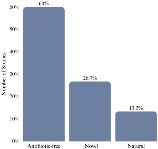 - ABF/reduced-antibiotic studies (n = 9; 60%): These examined consumer perspectives toward products marketed broadly as ABF or raised without antibiotics without specifying which alternative interventions enabled such claims.