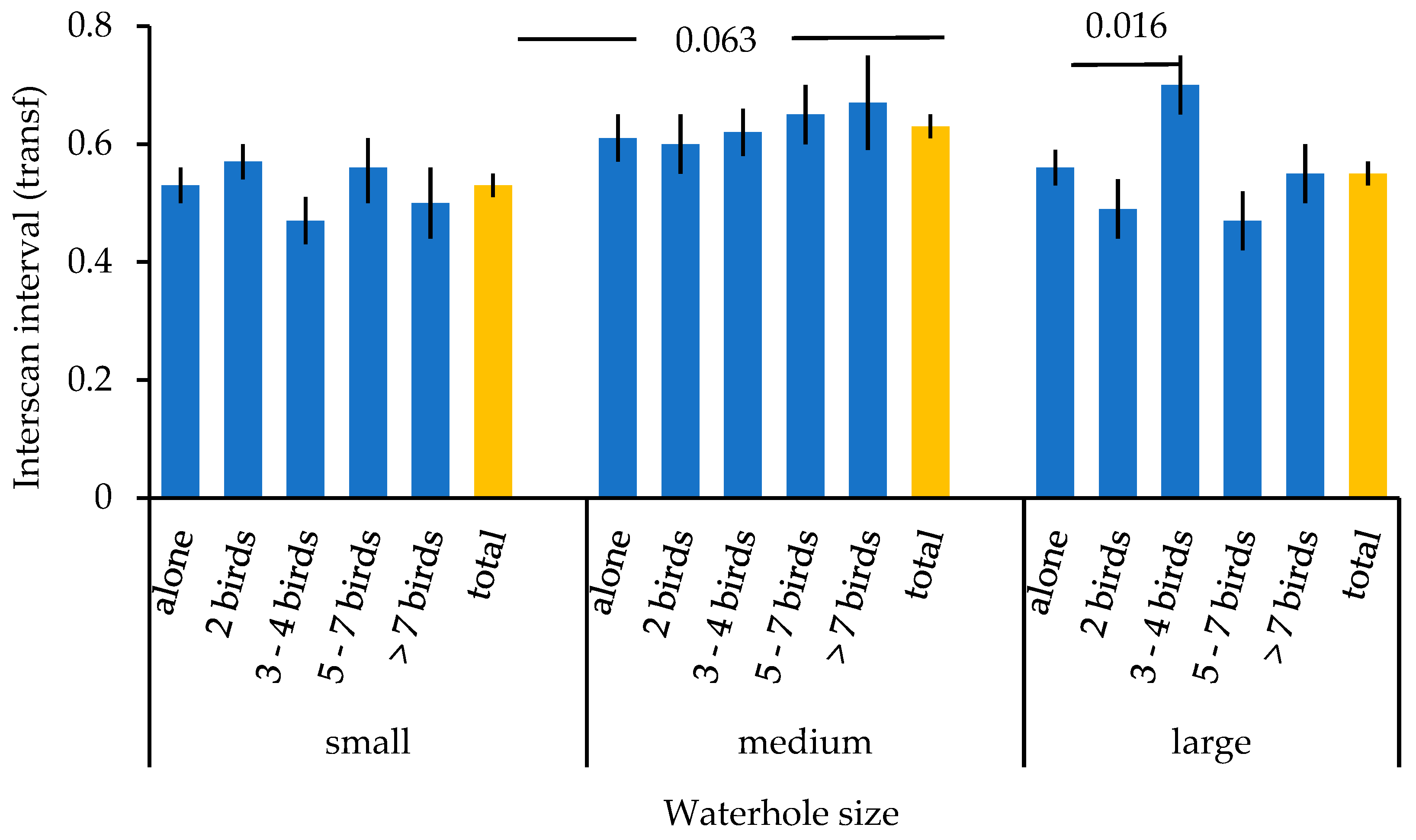 - Hofmann, G.; Mettke-Hofmann, C. Watch out! High vigilance at small waterholes when alone in open trees. PLoS ONE 2024, 19, e0304257. [Google Scholar] [CrossRef]