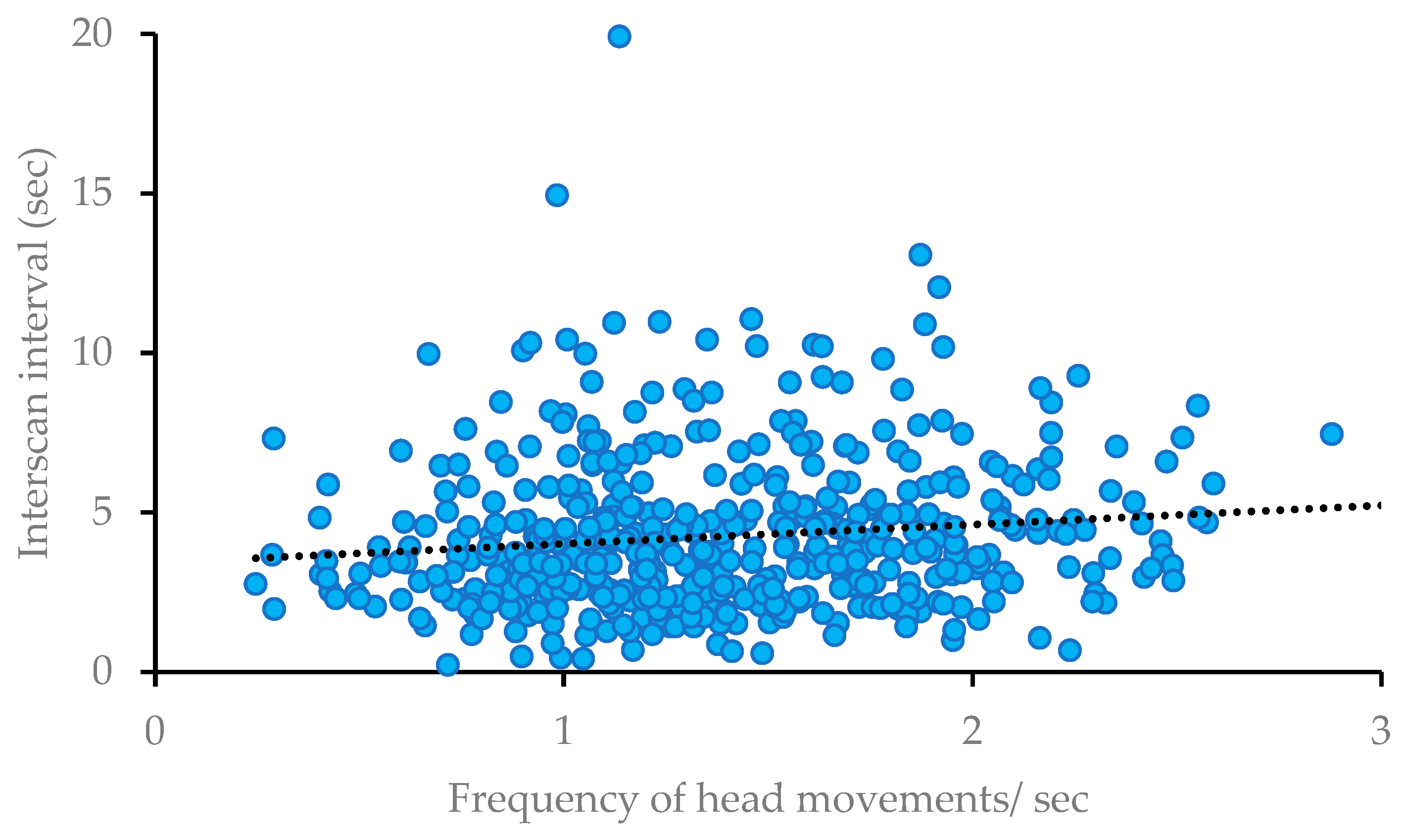 - Jones, K.A.; Krebs, J.R.; Whittingham, M.J. Vigilance in the third dimension: Head movement not scan duration varies in response to different predator models. Anim. Behav. 2007, 74, 1181–1187. [Google Scholar] [CrossRef]