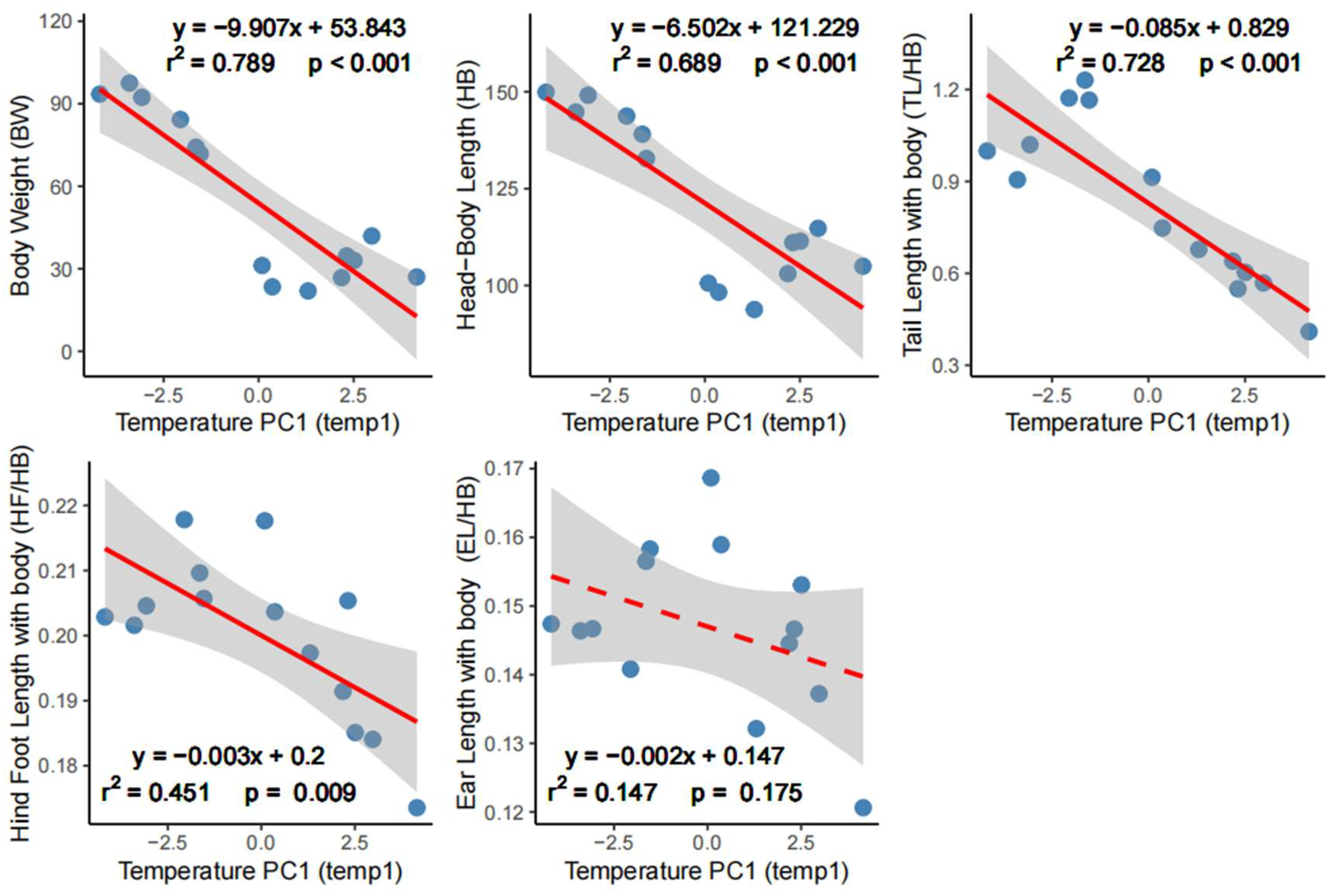 - Blackburn, T.M.; Hawkins, B.A. Bergmann’s rule and the mammal fauna of northern North America. Ecography 2004, 27, 715–724. [Google Scholar] [CrossRef]
