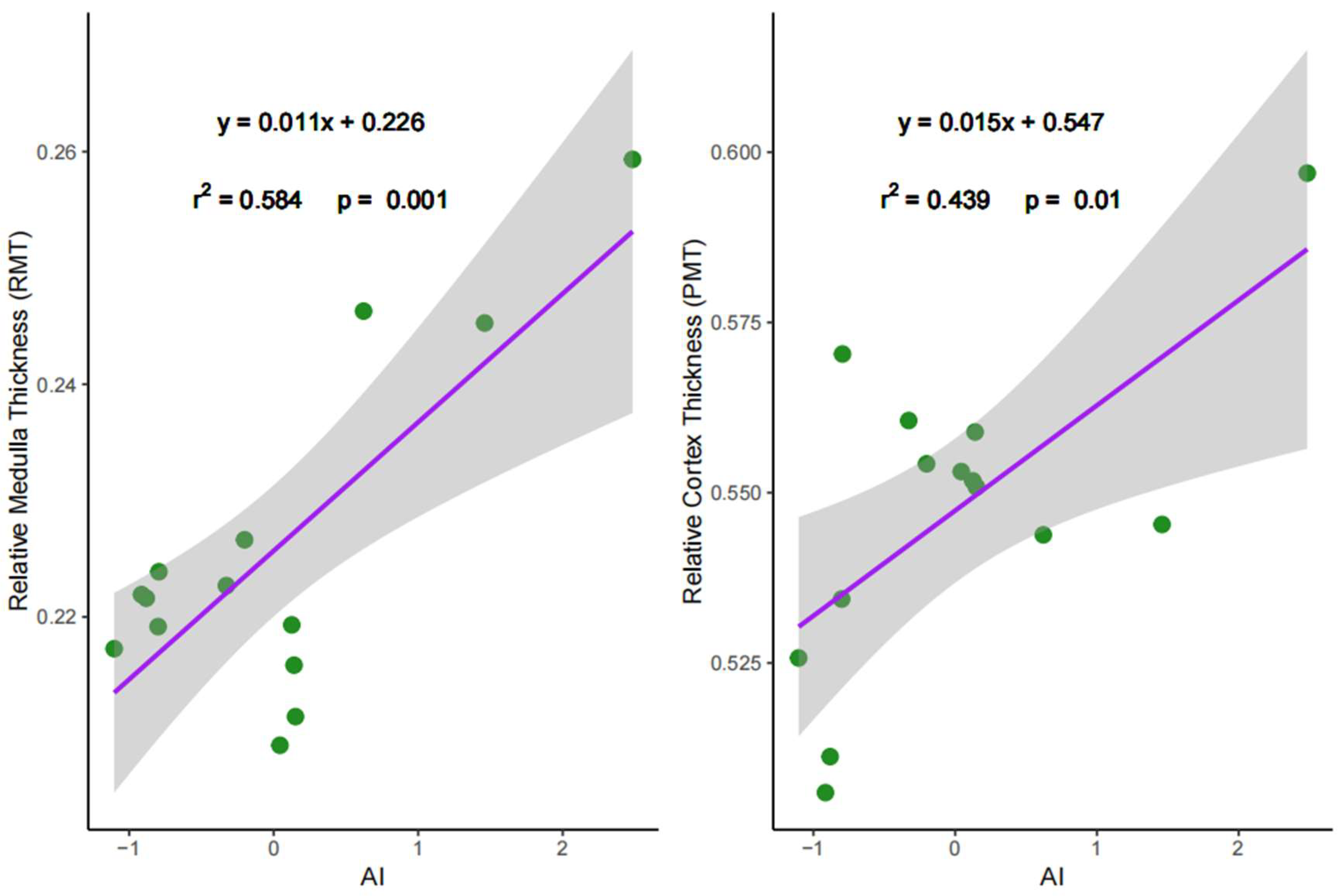 - Brownfield, M.S.; Wunder, B.A. Relative medullary area: A new structural index for estimating urinary concentrating capacity of mammals. Comp. Biochem. Physiol. Part A Physiol. 1976, 55, 69–75. [Google Scholar] [CrossRef] [PubMed]