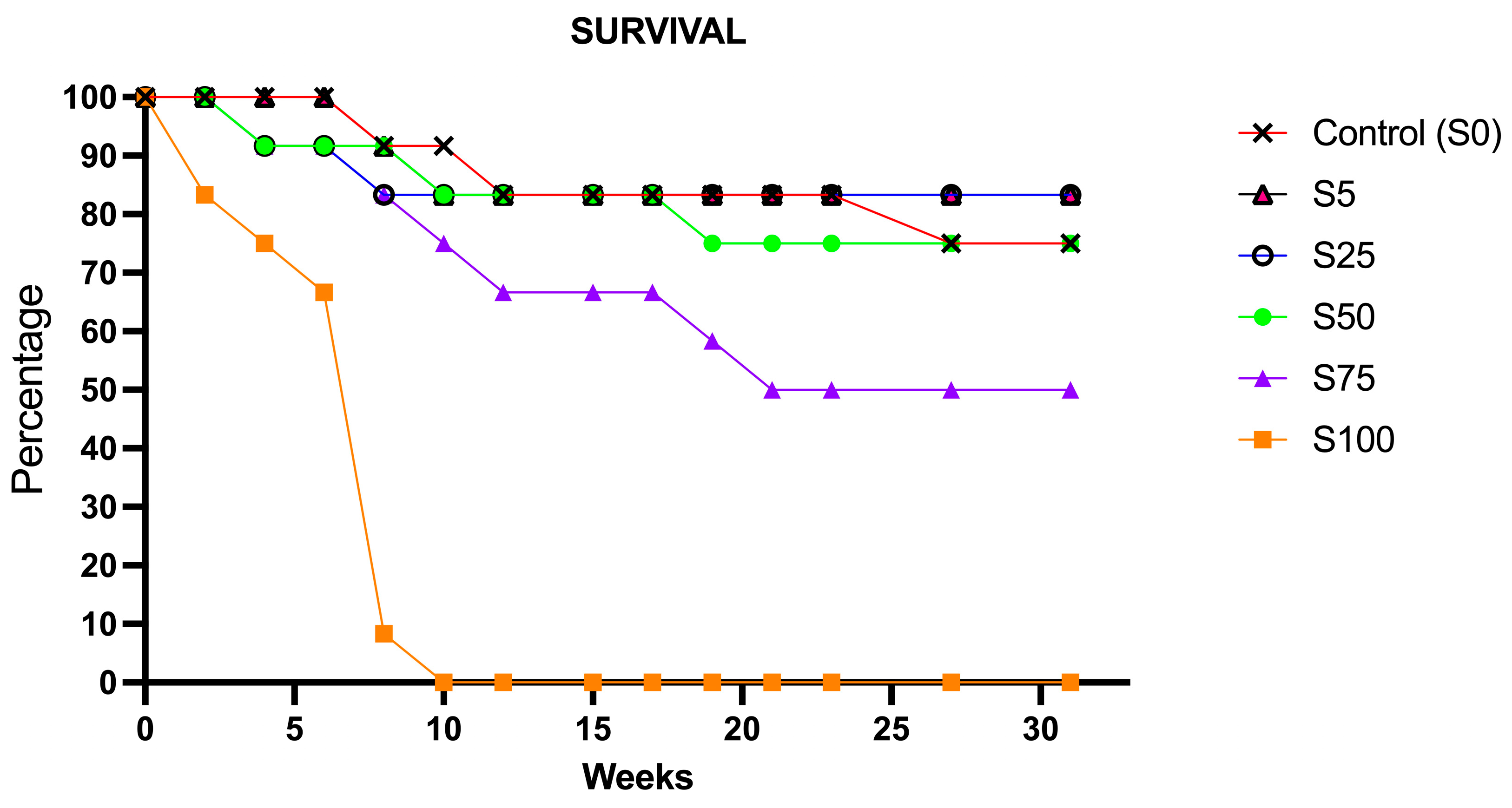 4.1. Effects of Spirulina on Survival and Growth Performance