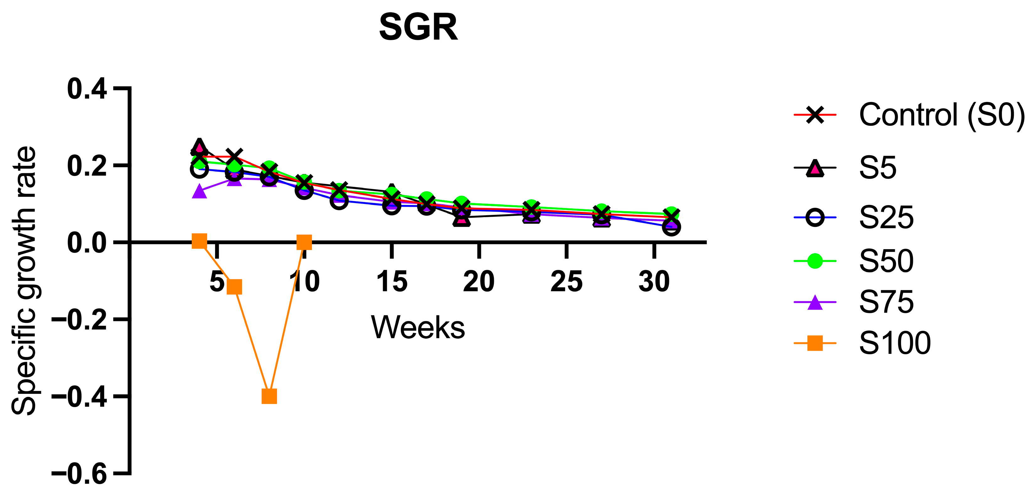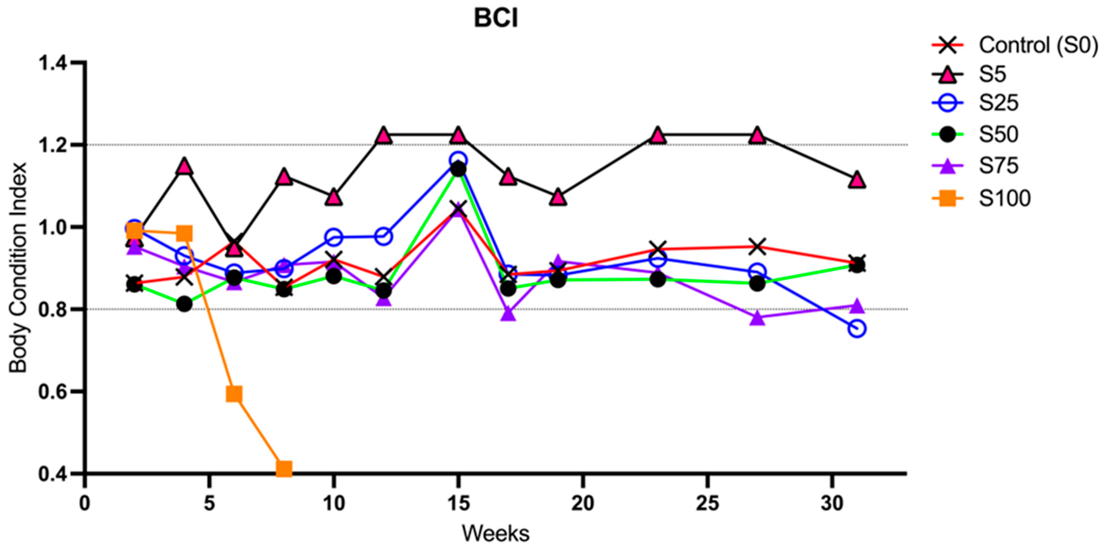 3.2. Body Measurements (Body Condition Index and Specific Growth Rate)