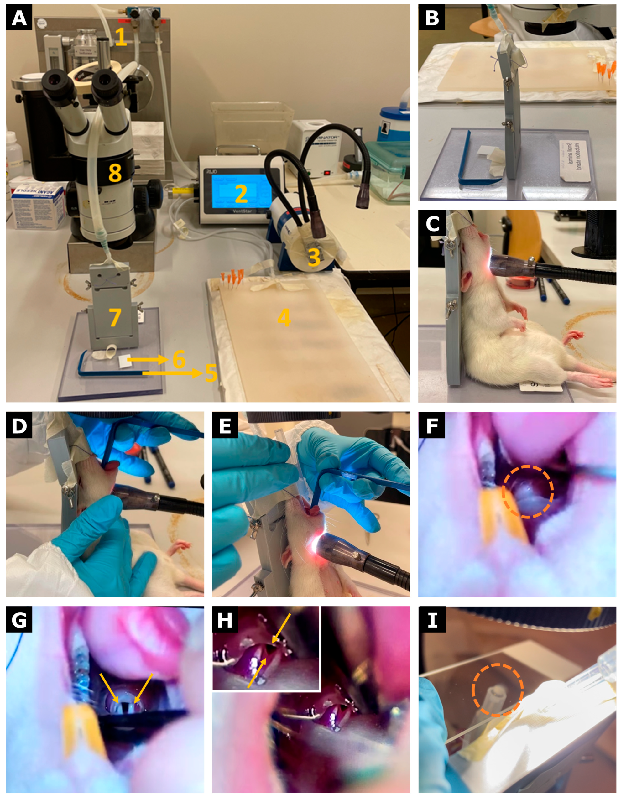 Prior to surgery, all instruments were tip-sterilized using a hot bead sterilizer (Thermo Fisher Scientific, Waltham, MA, USA) and arranged on a sterile field according to the order of use. The VentStar Small Animal Ventilator (RWD Life Science, San Diego, CA, USA) was set to volume mode with a respiratory rate of 55 breaths per minute, tidal volume of 2 mL, peak inspiratory pressure of 35 cmH2O, and positive end-expiratory pressure of 2 cmH2O. A heating pad was placed beneath a silicone mat (René Remie Surgical Skill Centre, Almere, The Netherlands) to maintain the animal’s body temperature during the procedure. 25 G needles (Terumo, Leuven, Belgium) served as anchor points at the corners of the mat to facilitate the attachment of silicone-coated retracting hooks (René Remie Surgical Skill Centre, Almere, The Netherlands). The intubation stand was positioned under a stereomicroscope (Wild Heerbrugg, Heerbrugg, Switzerland) and connected to an isoflurane delivery system (Eickemeyer, Tuttlingen, Germany). Snake lights (Avantor, Radnor, PA, USA) were arranged to illuminate the rat’s throat, improving visualization during intubation.