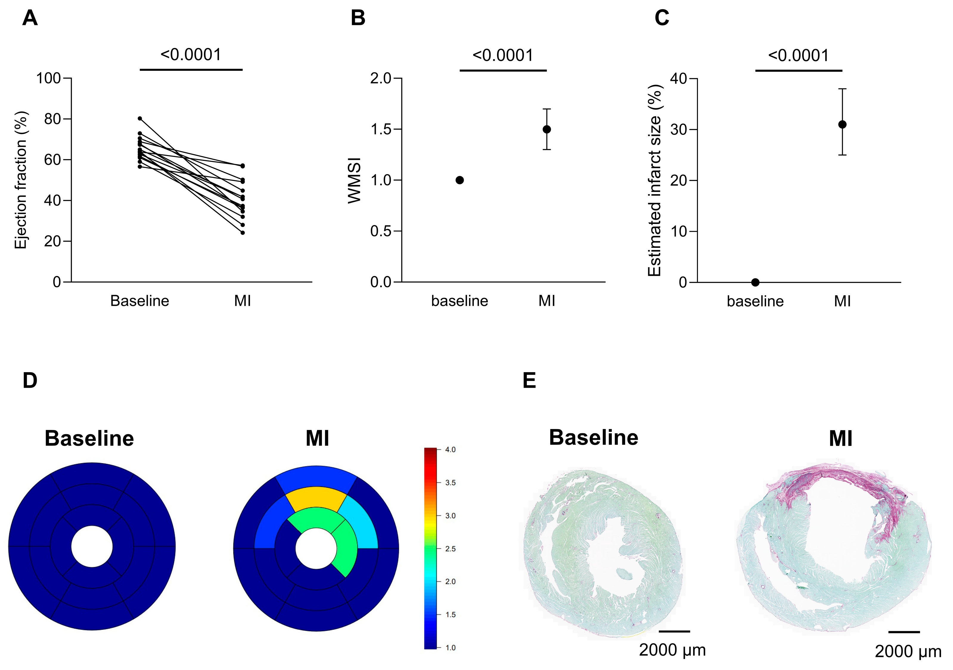 While intraoperative ECG recordings were not collected, infarct induction and functional consequences were validated using longitudinal echocardiographic assessment and histological analysis, which together provide robust confirmation of myocardial injury and remodeling. With this refined protocol, we were able to consistently induce MI. Echocardiographic analysis showed a marked reduction in LVEF (median 40.7%), which falls within the range typically reported after MI in similar models [