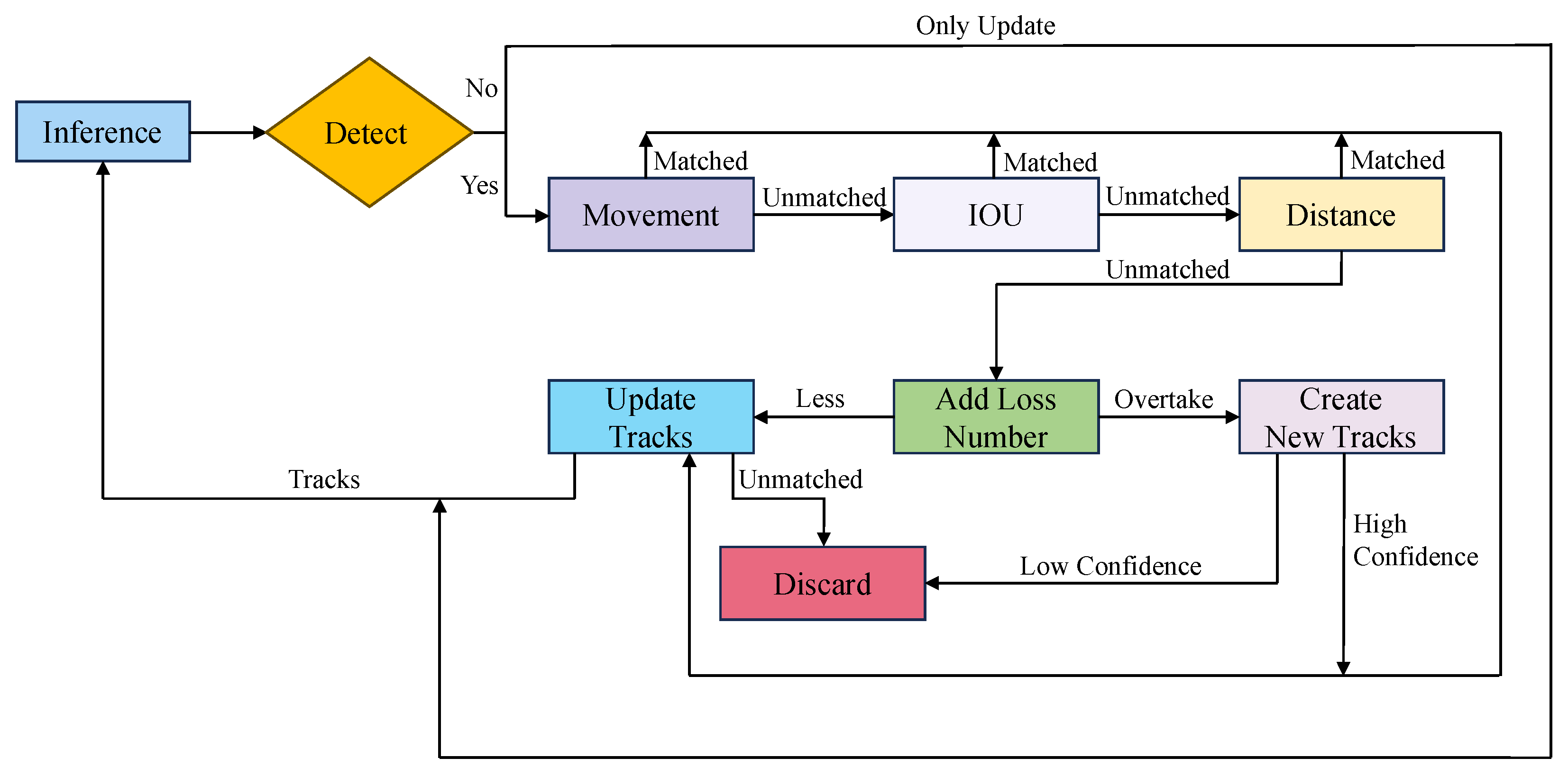- Cao, J.; Pang, J.; Weng, X.; Khirodkar, R.; Kitani, K. Observation-centric SORT: Rethinking SORT for robust multi-object tracking. In Proceedings of the 2023 IEEE/CVF Conference on Computer Vision and Pattern Recognition (CVPR), Vancouver, BC, Canada, 17–24 June 2023; pp. 9686–9696. [Google Scholar]