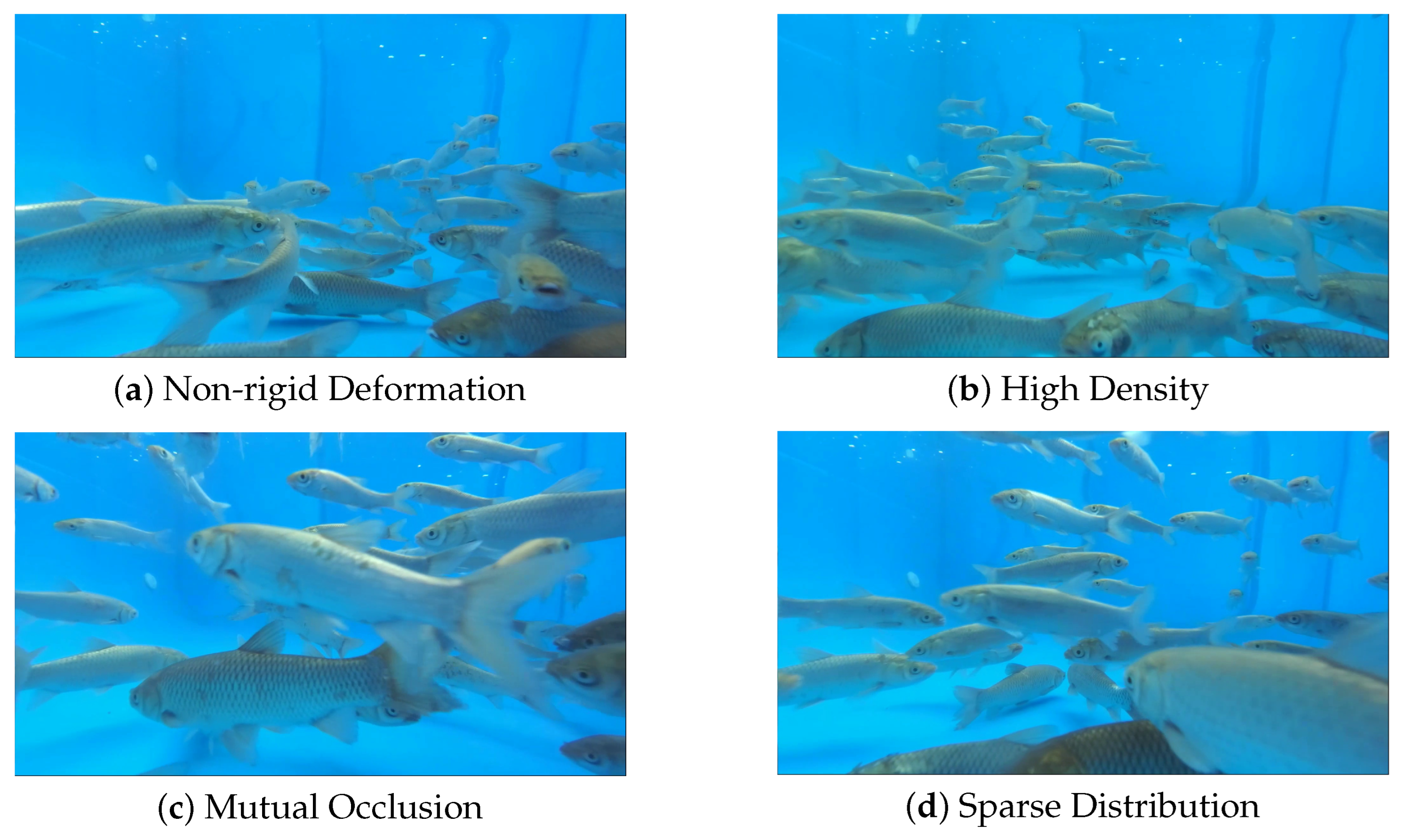 - Huang, J.; Yu, X.; An, D.; Ning, X.; Liu, J.; Tiwari, P. Uniformity and deformation: A benchmark for multi-fish real-time tracking in the farming. Expert Syst. Appl. 2025, 264, 125653. [Google Scholar] [CrossRef]