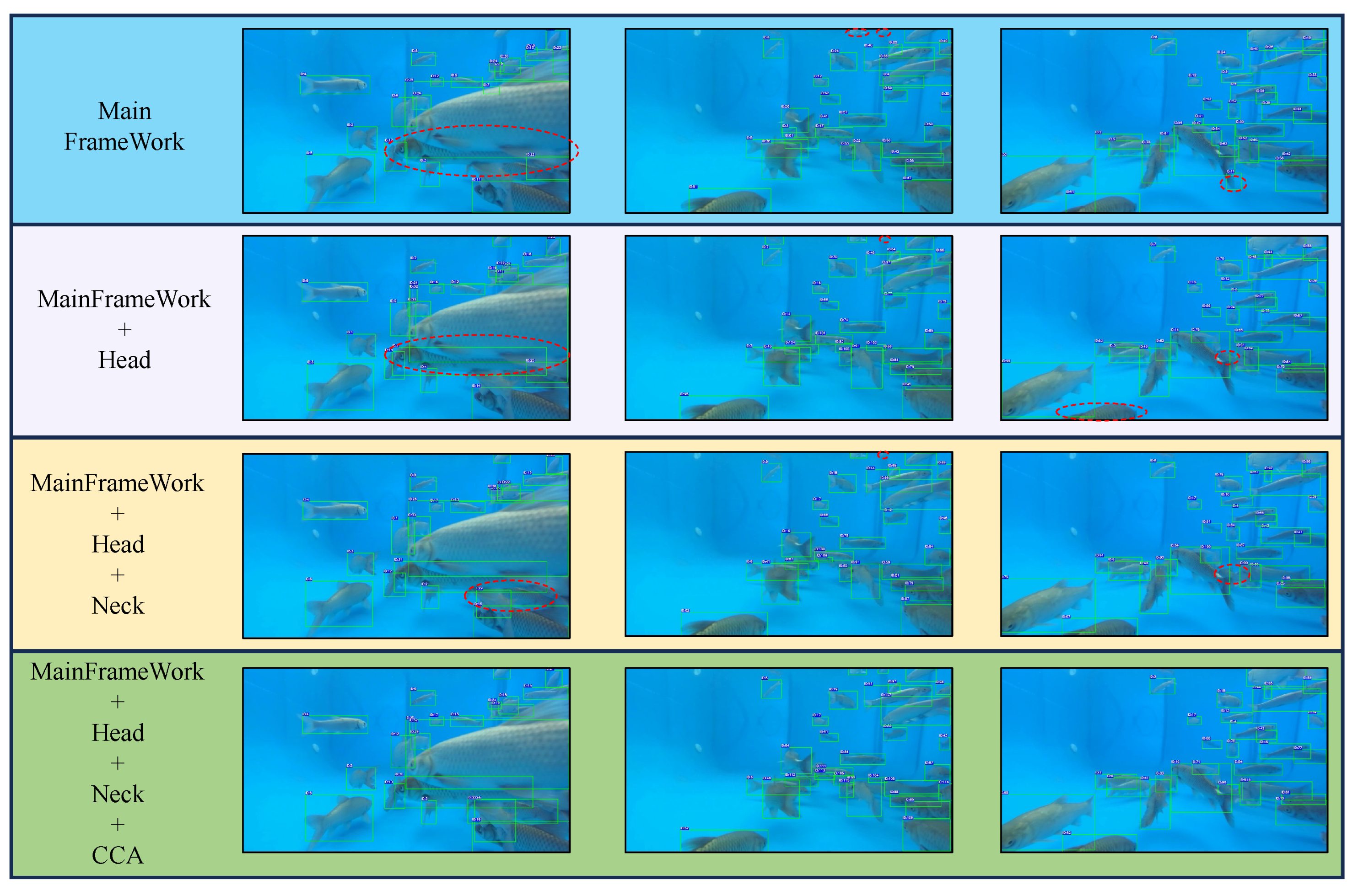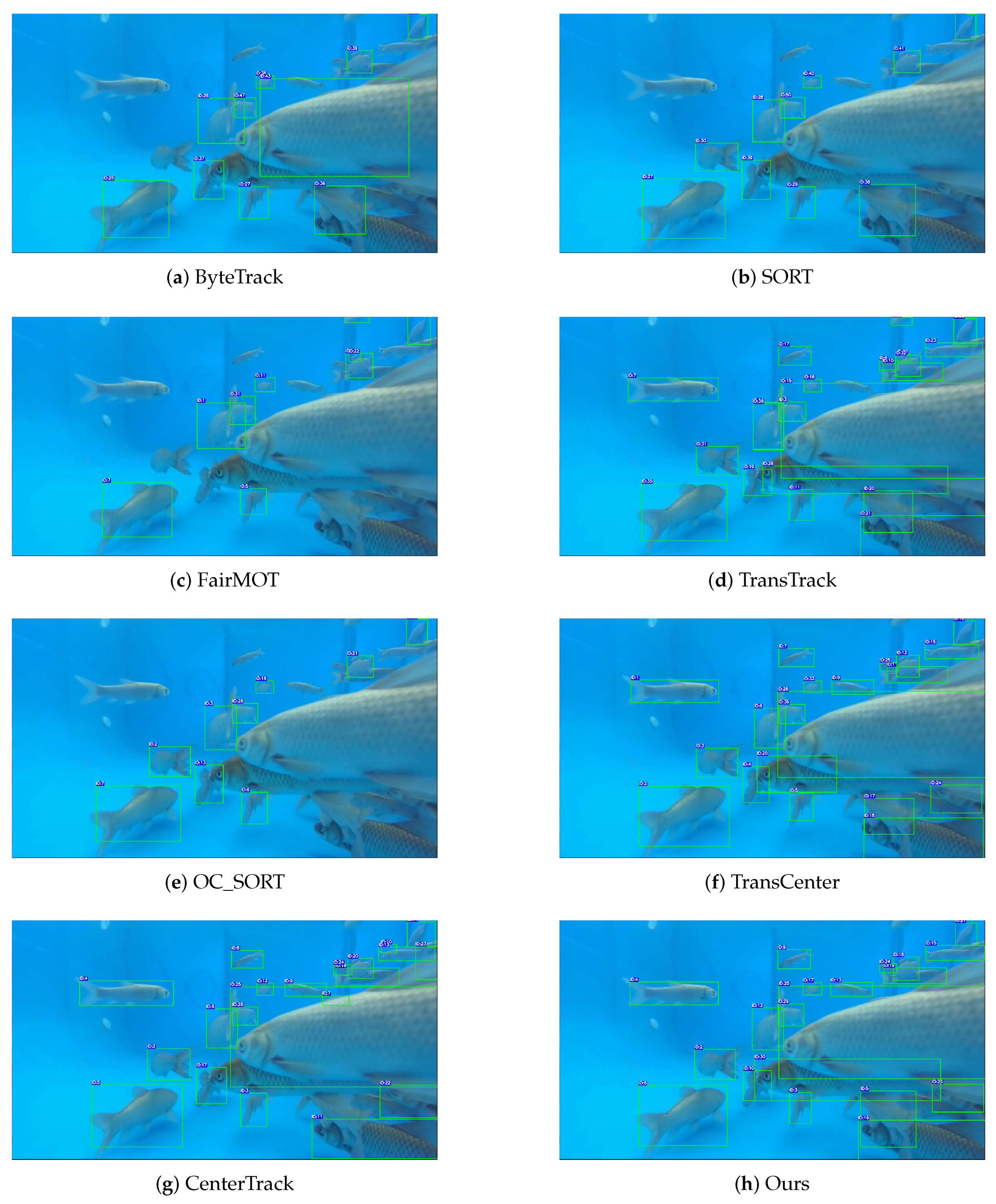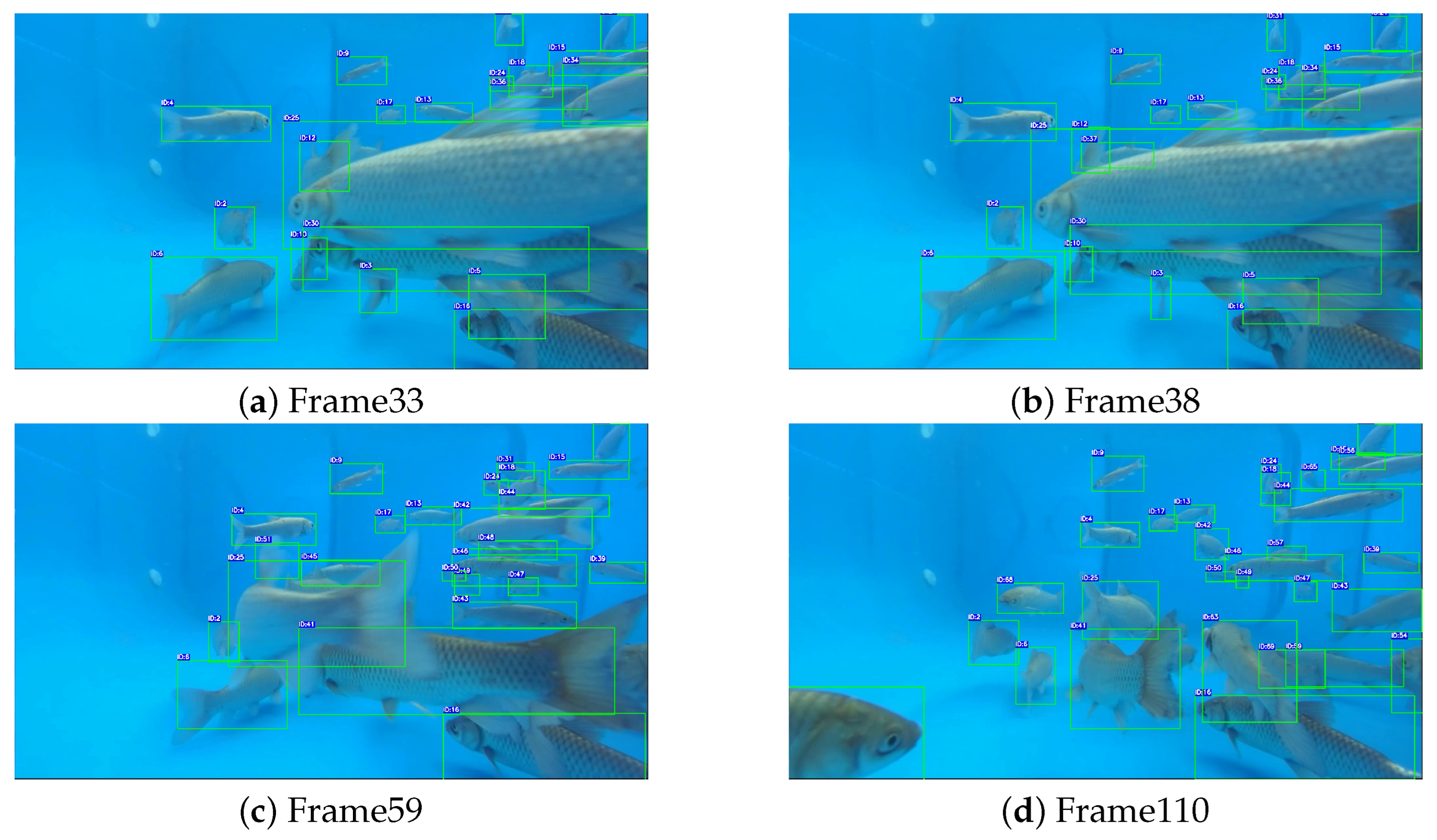 - Environmental diversity and domain shift: Experiments were conducted in relatively controlled tank environments that simulate industrial aquaculture. Although these settings capture realistic occlusion and crowding patterns, environmental diversity remains limited. Variations in illumination, water turbidity, camera viewpoints, and background complexity in real production facilities may introduce domain shifts, potentially degrading tracking performance when the model is directly applied without further adaptation.