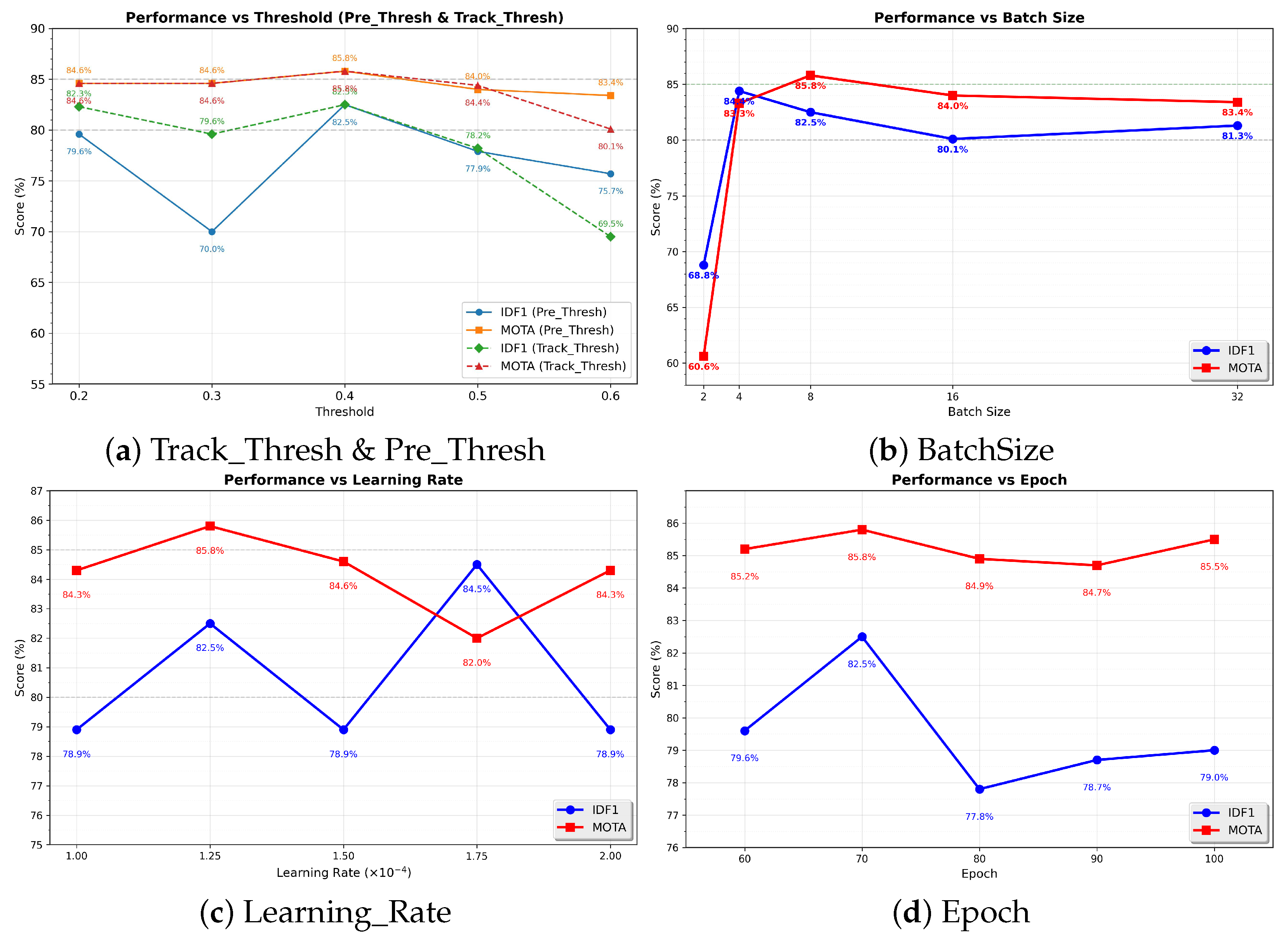 - Computational constraints and deployment: Although a systematic analysis of computational efficiency across different hardware platforms was not conducted, the proposed framework achieves real-time tracking under the current experimental configuration with 30 FPS input video on a single RTX 4090 GPU. The introduced multi-stage association and motion modeling components are lightweight and do not substantially increase computational complexity compared to the baseline CenterTrack framework. Nevertheless, deployment on resource-constrained edge devices remains challenging due to the deep backbone. Future work will focus on model compression, backbone optimization, and lightweight association strategies to further improve deployment flexibility.