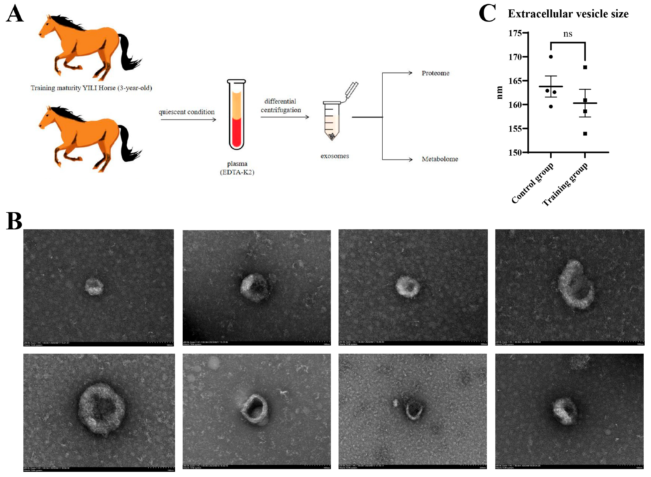 Yuan X, Yao X, Zeng Y, Wang J, Ren W, Wang T, Li X, Yang L, Yang X, Meng J. The Effect of Training on the Expression of Protein and Metabolites in the Plasma Exosomes of the Yili Horse. Animals. 2026; 16(2):158. https://doi.org/10.3390/ani16020158