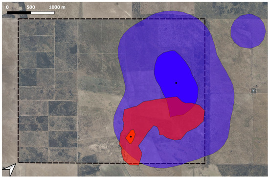 Overlap between the HRs of a male Pampas fox and a livestock protection dog (LPD) during the lambing period. The red area represents the HR of the LPD and the blue area represents the HR of the male Pampas fox; in both HRs, the larger, transparent areas represent 95% HR, the more solid-colored areas the 30% HR, and the black dots the HR centers. The box with dotted lines represents the limit of the Patagones Experimental Farm, central Argentina.