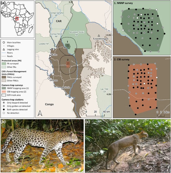 We conducted camera trap surveys in the southern sector of NNNP and the adjacent Kabo FMU over four- and six-month periods, respectively, between August 2022 and February 2023. Each survey site featured a grid of 63 paired camera trap stations. Grid size and camera trap spacing were designed considering species-specific monitoring guidelines for golden cats [44] and leopards [63] in comparable habitats.