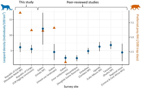 Leopard population density estimates (blue circles, left Y-axis) across survey sites in Central and East Africa, organized by country and land-use type (X-axis), with error bars showing the standard error for each estimate. Site labels include country names and land-use categories in parentheses (NP = National Park). Estimates are based on this study’s surveys and previously published studies from Gabon [90], Mozambique [91], Zimbabwe [92], Uganda [93], and Tanzania [94]. The final label on the X-axis represents the regional mean leopard density across protected areas in Central and East Africa reported in the literature [95]. Relative abundance index (RAI) of red river hog (Potamochoerus porcus), a key leopard prey species, was available only for the first five sites and is shown as orange triangles (right Y-axis).