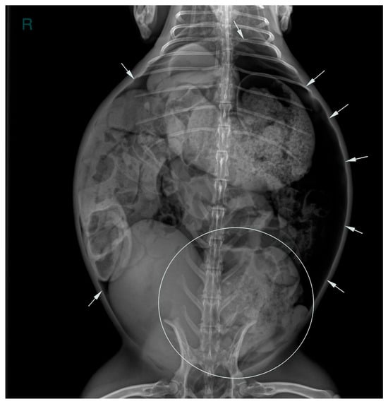 Ventrodorsal abdominal radiographic view (kVp: 50, mAs; 2.4); the ‘R’ marker indicates the right side of the abdomen. Marked distension of the descending colon due to amorphous, partially mineralized material (circle) and the presence of free gas within the peritoneal cavity (white arrows).