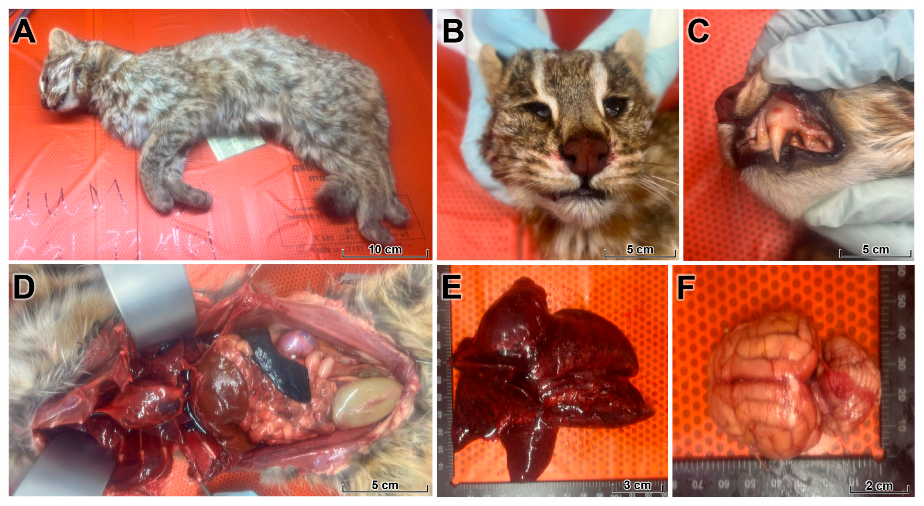 24], which focused on the genetic features and evolutionary relationships of the virus in relation to contemporary wild-bird H5N1 strains. However, that genomic report provided only limited information on the clinical course, gross lesions, histopathological changes, and tissue distribution of viral antigen in the affected animal. Documenting such cases is essential to improve our understanding of how HPAI viruses maintained in wild birds’ spillover into terrestrial carnivores and to refine risk assessments for wildlife, domestic animals, and humans. In this study, we provide a detailed clinicopathological and epidemiological description of a fatal HPAI H5N1 clade 2.3.4.4b infection in a free-ranging leopard cat, and we discuss its implications for conservation and One Health-oriented avian influenza mitigation, which integrates human, animal, and ecosystem health.