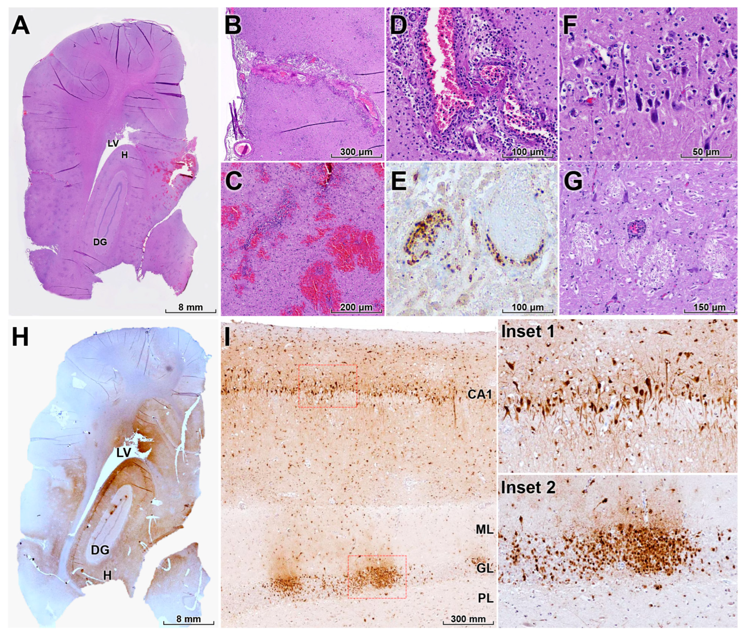 Figure 4A). Severe nonsuppurative meningoencephalitis was observed, extending into the leptomeninges and characterized by mononuclear inflammatory infiltrates and multifocal to locally extensive hemorrhages (
