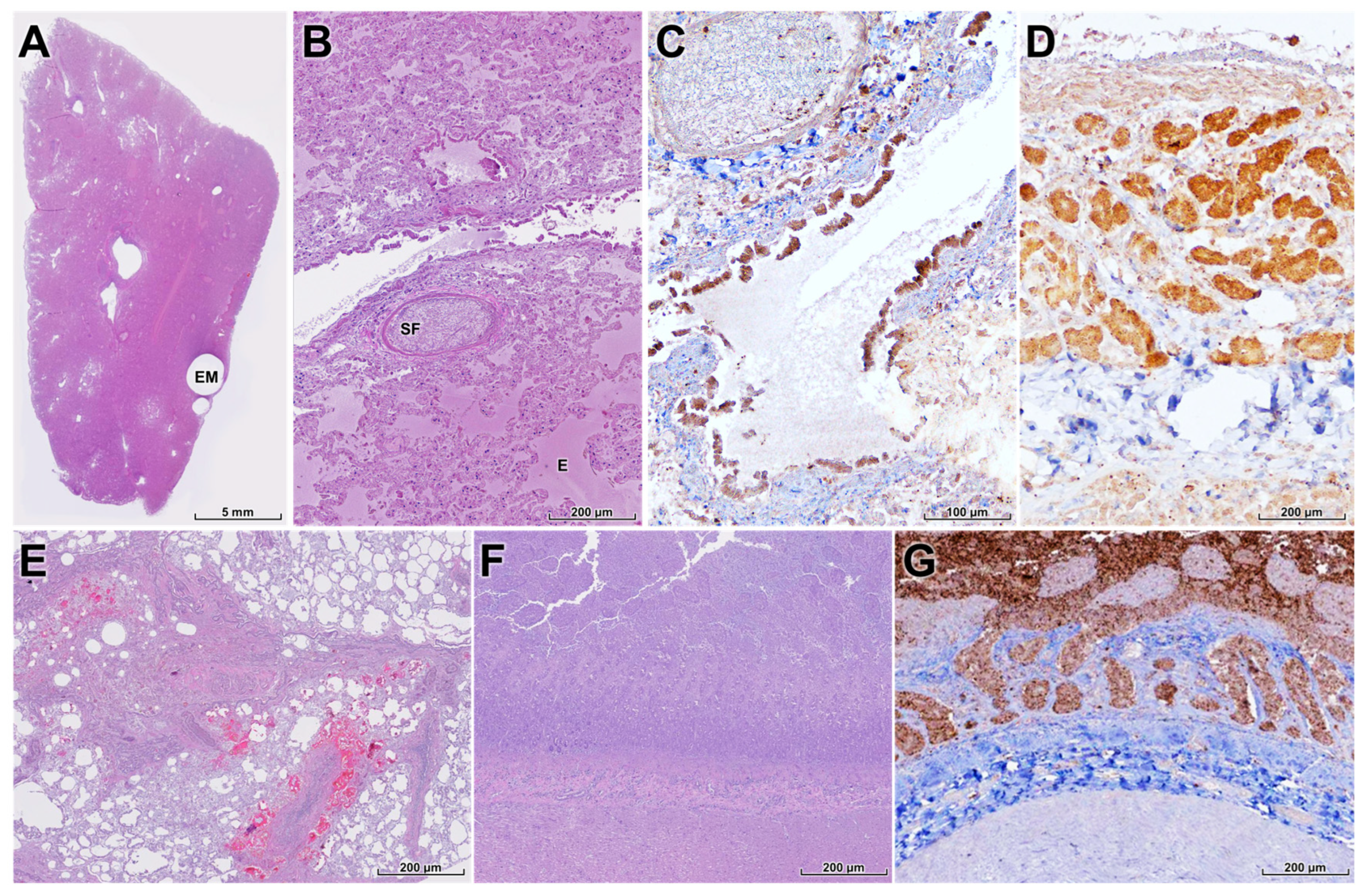 Figure 5A,B). There was marked epithelial necrosis in the bronchial and bronchiolar epithelium, and IHC demonstrated strong viral antigen labeling in these epithelial cells (