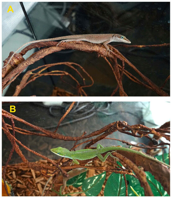 The skin colors of the Anolis carolinensis. (A) Brown; (B) Green.