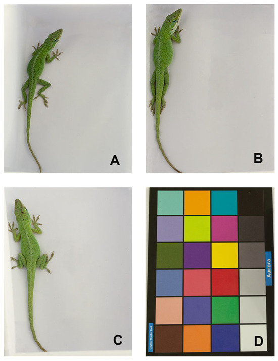 Skin color changes in the same Anolis carolinensis individual under different ambient temperatures. (A) 20 °C; (B) 30 °C; (C) 40 °C; (D) 24-color checkerboard.