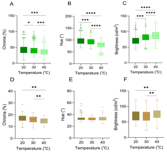 There were significant differences in chroma among different ambient temperatures of 20 °C, 30 °C, and 40 °C (Friedman test, df = 2, p < 0.0001) (Table 1, Figure 4A).