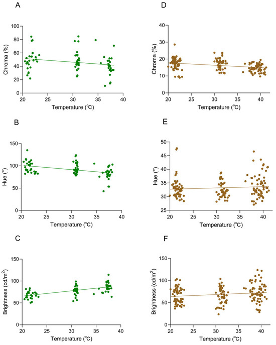 Correlations between body temperature and coloration in Anolis carolinensis at different ambient temperatures. (A–C) White background; (D–F) brown background. (A,D) Chroma values (Pearson’s r = −0.3022, p < 0.0001; Pearson’s r = −0.3976, p < 0.0001). (B,E) Hue values (Pearson’s r = −0.1505, p > 0.05; Pearson’s r = 0.04788, p > 0.05). (C,F) Brightness values (Pearson’s r = 0.6262, p < 0.0001; Pearson’s r = 0.1643, p = 0.0298). The dots in the graph represent the body temperature and chroma (hue/brightness) values of the individual at that ambient temperature, and the straight line is a linear regression line.