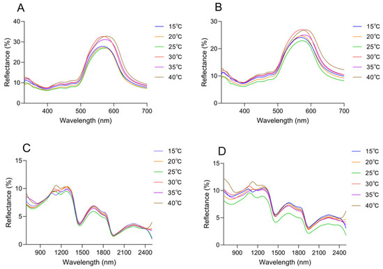 Changes in spectral reflectance of the dorsal and head surfaces were observed across the range of ambient temperatures. It peaked in the green spectrum range (580 nm), and subtle differences were presented in the curve shape (Figure 7A,B). The peak wavelength increased with rising temperature, reaching its maximum at 40 °C. The peak wavelength of the dorsal thorax rose from 567.17 nm at 15 °C to 578.87 nm at 40 °C, with reflectance increasing from 26.61 ± 0.66% to 31.40 ± 0.66%; the peak wavelength of the dorsal head increased from 569.51 nm to 584.71 nm, while reflectance rose from 23.62 ± 0.92% to 25.52 ± 1.41% (Table 2). Notably, under the same temperature conditions, a comparative analysis of the reflectance between the head and trunk reveals that the reflectance of the dorsal side of the head exhibits a significant difference (Supplementary Materials Figure S5).