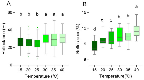 Skin spectral reflectance of the Anolis carolinensis at different ambient temperatures. (A) Peak reflectance in the 300–700 nm range. (B) Peak reflectance around 1100 nm. Boxes that do not share the same letter are significantly different from each other (p < 0.05) as determined by a Friedman test. Boxplots are represented by medians and whiskers (within 1.5 times of the interquartile range) the dots outside the box represent discrete values.