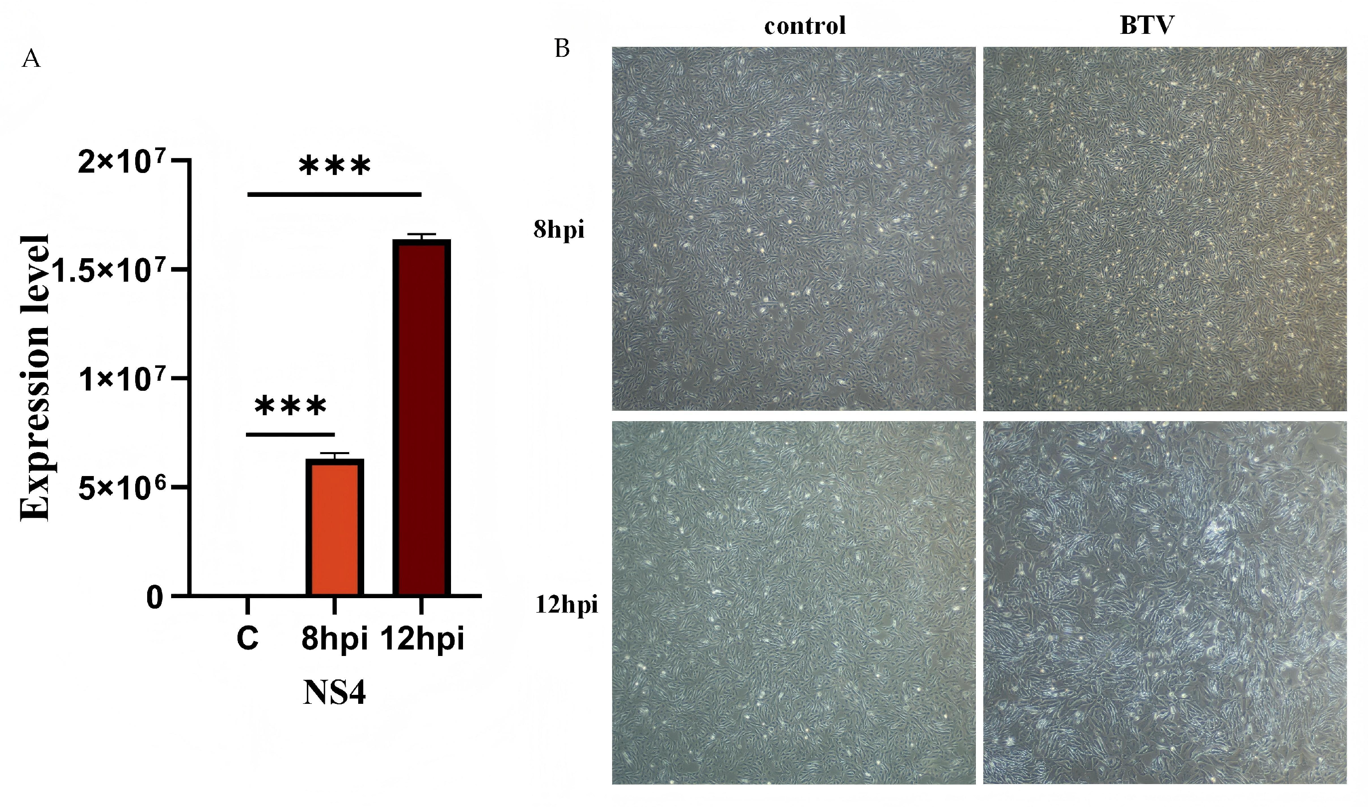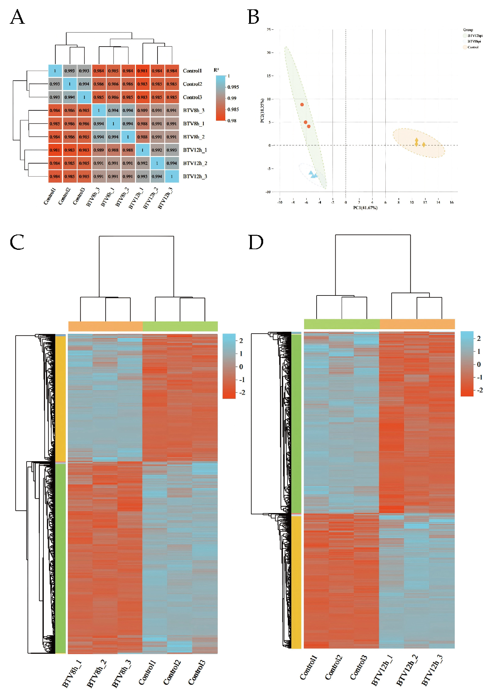 - Du, J.; Gao, S.; Tian, Z.; Guo, Y.; Kang, D.; Xing, S.; Zhang, G.; Liu, G.; Luo, J.; Chang, H.; et al. Transcriptome Analysis of Responses to Bluetongue Virus Infection in Aedes Albopictus Cells. BMC Microbiol. 2019, 19, 121. [Google Scholar] [CrossRef] [PubMed]