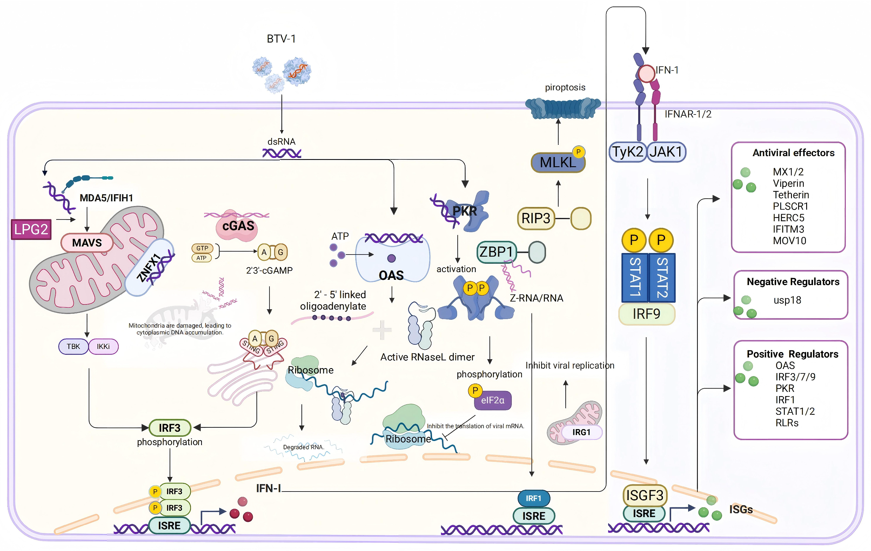 - Li, Q.; Cai, X.; Luo, S.; Chen, Y.; Yi, H.; Ma, X. Advances in the anti-host interferon immune response of bluetongue virus. Chin. J. Biotechnol. 2024, 40, 4439–4451. [Google Scholar] [CrossRef]