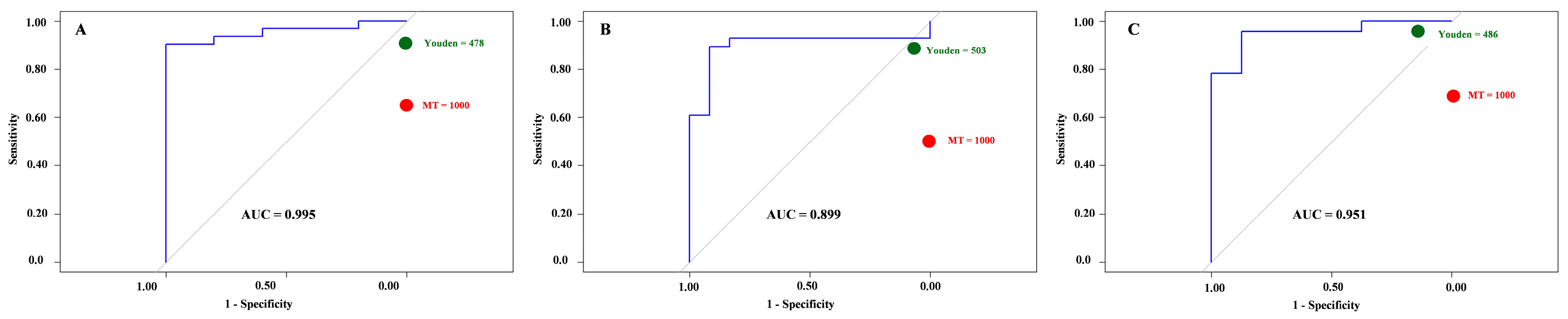 NPV) reported. All ROC analyses were conducted separately for each sampling time point (T1–T3).