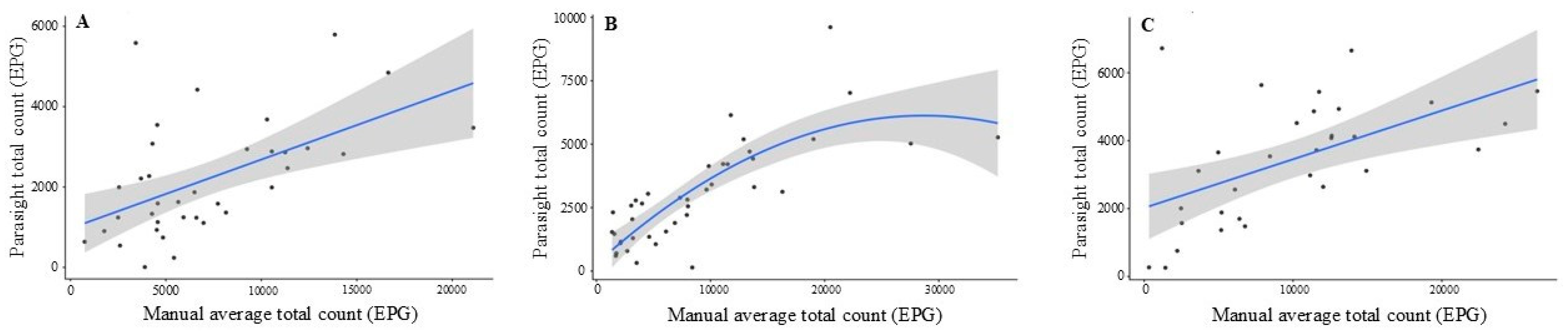 Haemonchus contortus with both strong correlation and Lin’s concordance relative to manual fluorescence microscopy and coproculture (R