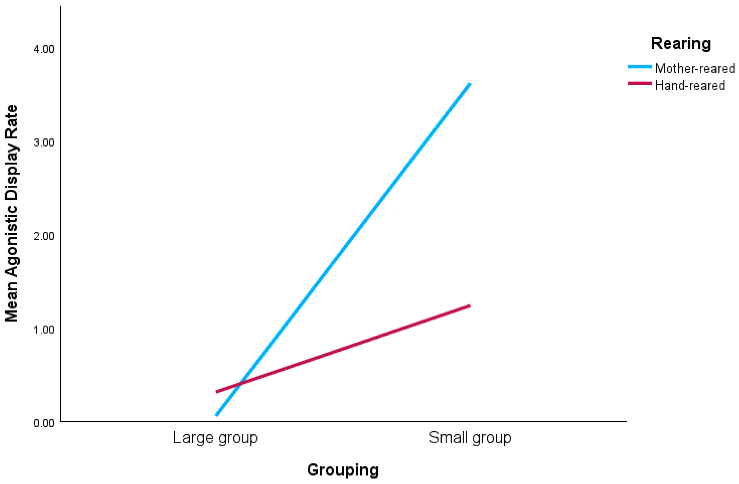 In addition, there were interactions between grouping and rearing on chimpanzee social behavior. Individuals in small groups engaged in agonistic displays more frequently than those in larger groups and mother-reared chimpanzees displayed more than hand-reared individuals. Interactions between grouping and rearing on agonistic display rate show specifically that mother- and hand-reared chimpanzees displayed more when they were housed in small groups compared to when housed in larger groups.