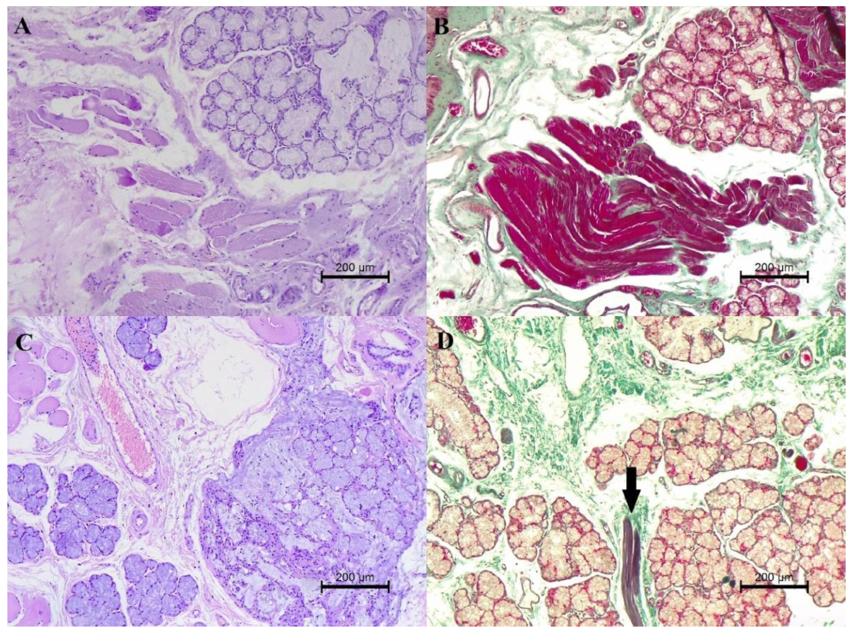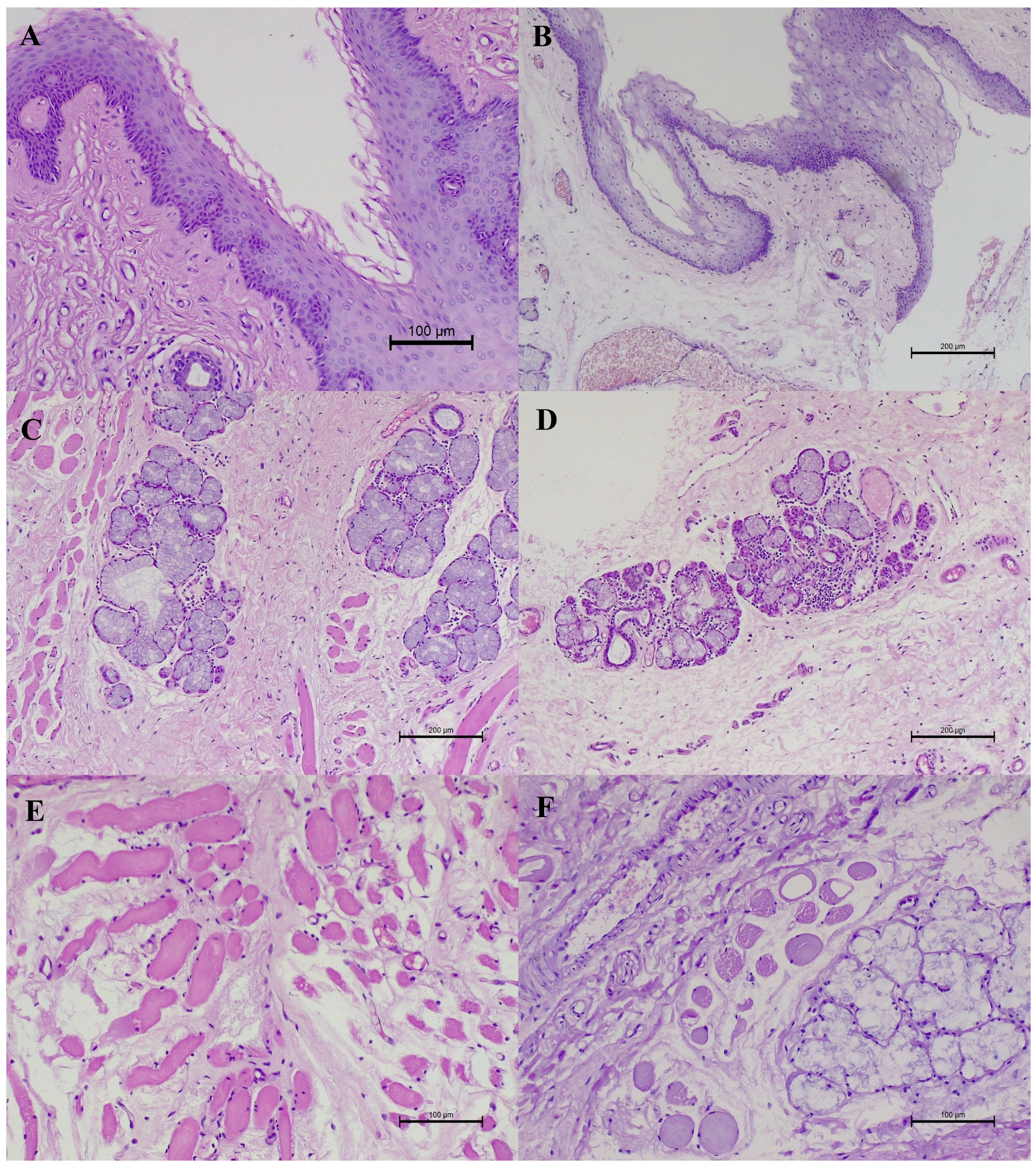 - Arai, K.; Kobayashi, M.; Harada, Y.; Hara, Y.; Michishita, M.; Ohkusu-Tsukada, K.; Takahashi, K. Histopathologic and immunohistochemical features of soft palate muscles and nerves in dogs with an elongated soft palate. Am. J. Vet. Res. 2016, 77, 77–83. [Google Scholar] [CrossRef]