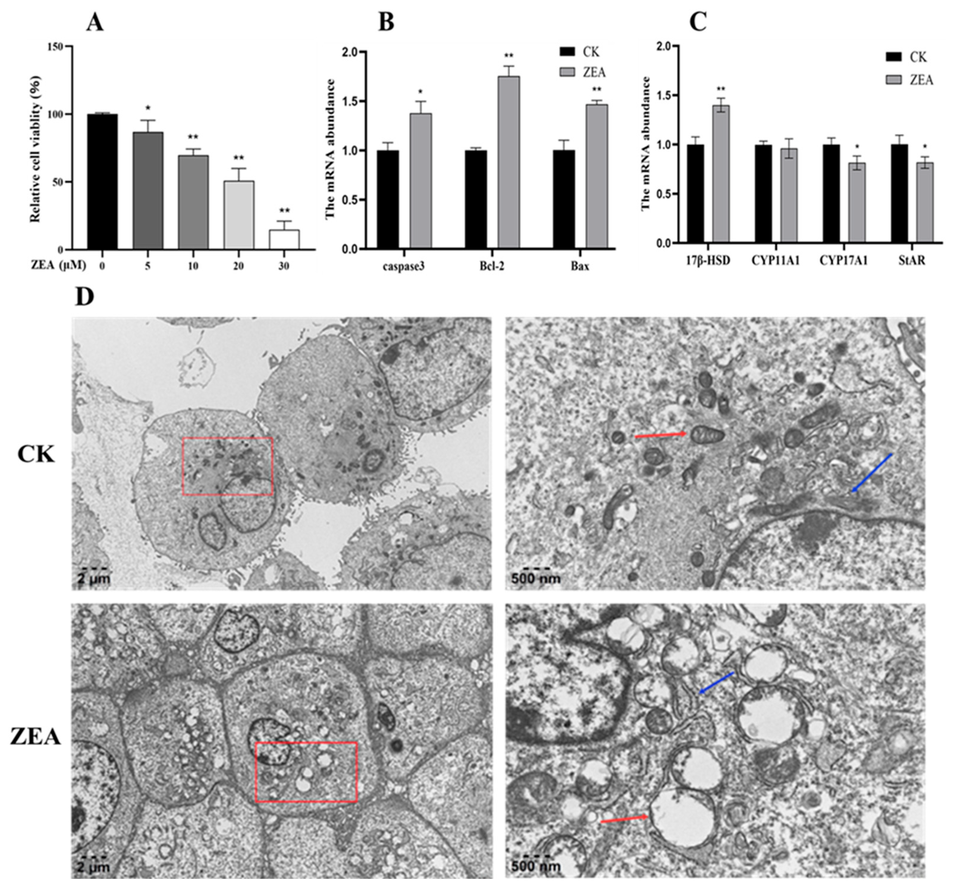 3.3. Effects of ZEA on mRNA Expression of Genes Related to LCs