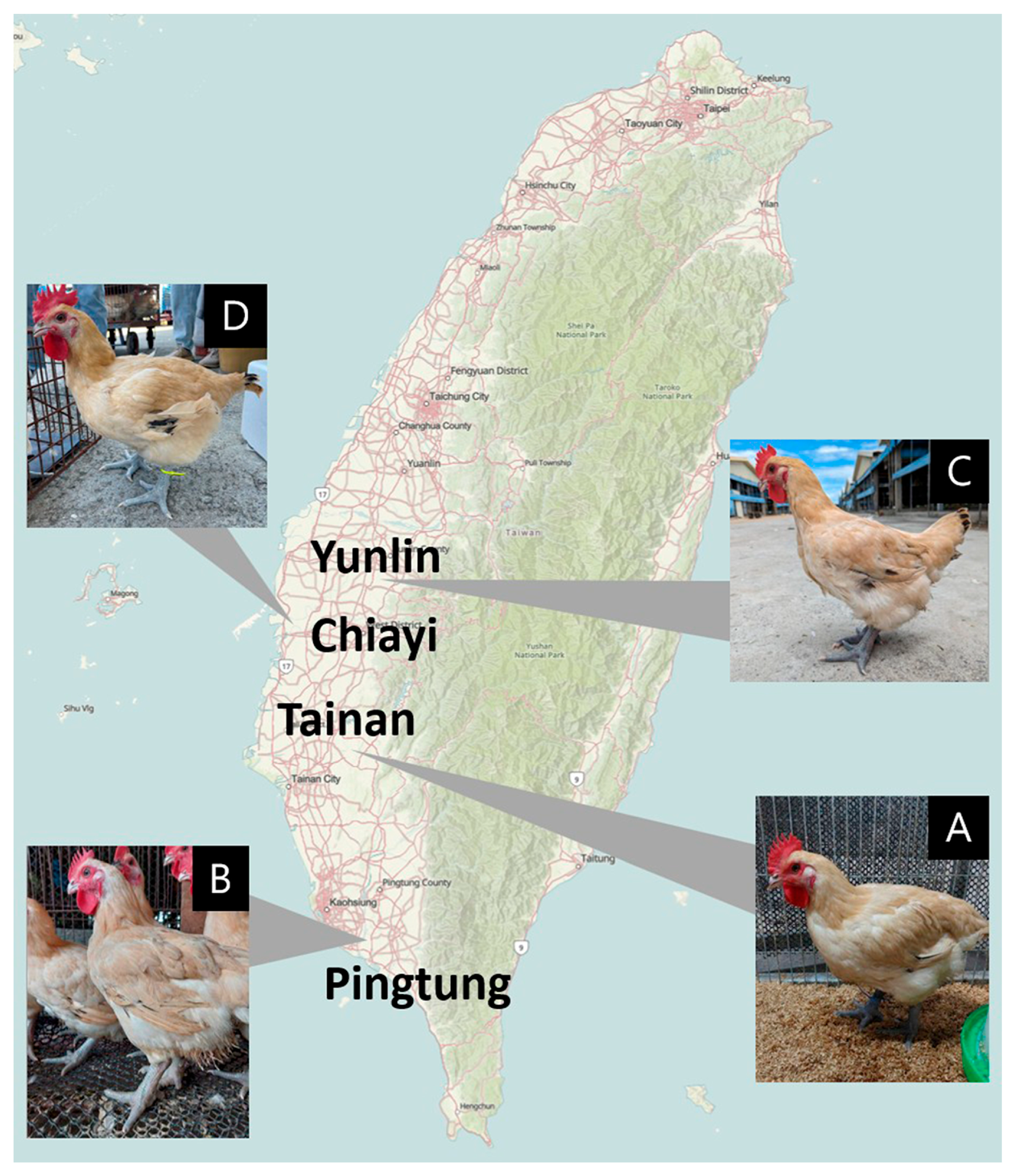 1. Chang, C.-S.; Chen, C.; Berthouly-Salazar, C.; Chazara, O.; Lee, Y.; Chang, C.; Chang, K.; Bed’Hom, B.; Tixier-Boichard, M. A global analysis of molecular markers and phenotypic traits in local chicken breeds in Taiwan. Anim. Genet. 2012, 43, 172–182. [Google Scholar] [CrossRef] [PubMed]