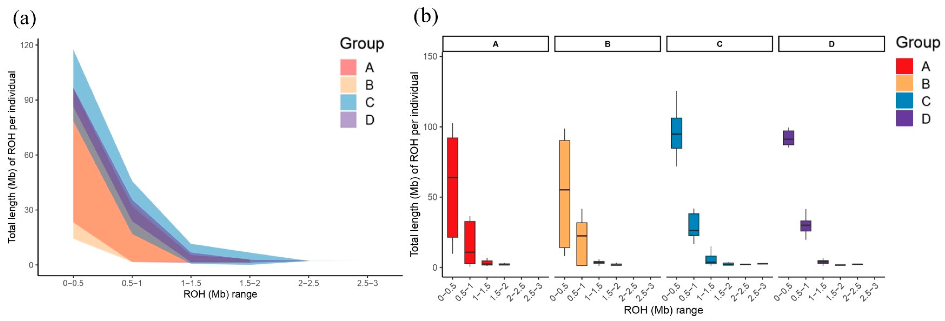 Runs of homozygosity were identified using PLINK (v1.9) to evaluate inbreeding levels and genomic relatedness within and among populations. ROH segments were categorized by length into six classes: 0–0.5 Mb, 0.5–1 Mb, 1–1.5 Mb, 1.5–2 Mb, 2–2.5 Mb, and 2.5–3 Mb.